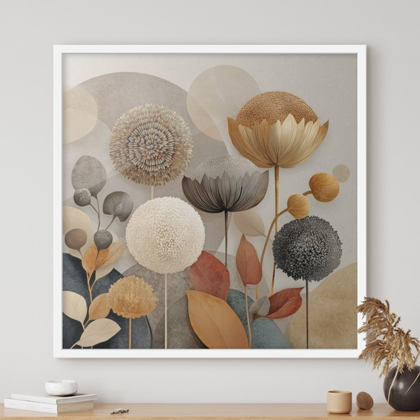 Formes abstraites, pierres texturées et feuilles dans des tons pêche et terre cuite discrets, minimalistes, fond crème.
