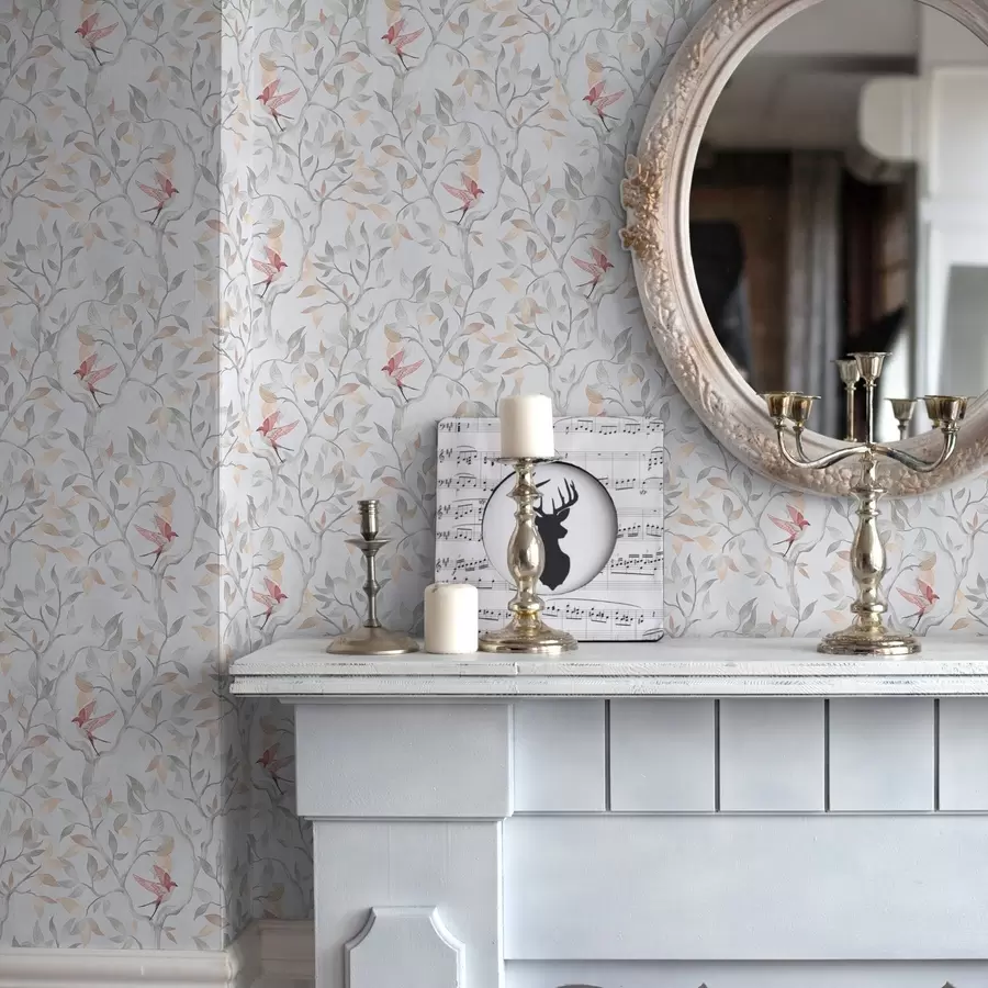 Papier peint Branches légères avec feuilles et oiseaux dans les tons pêche