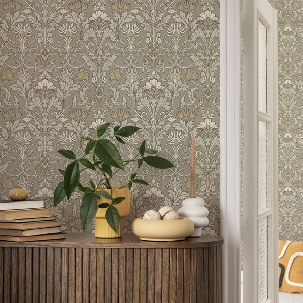 Papier peint Motif damassé clair avec des roses grises dans des losanges doux
