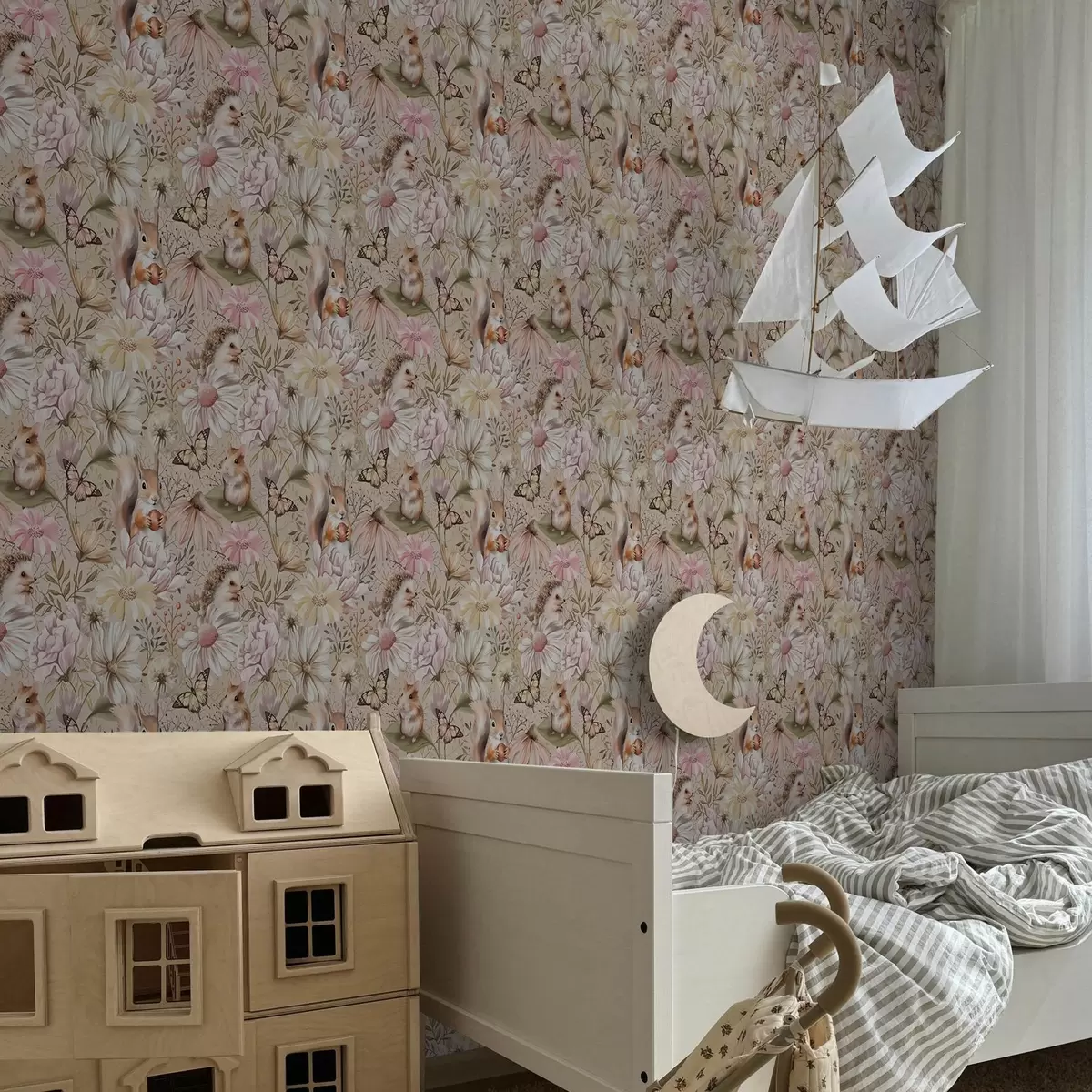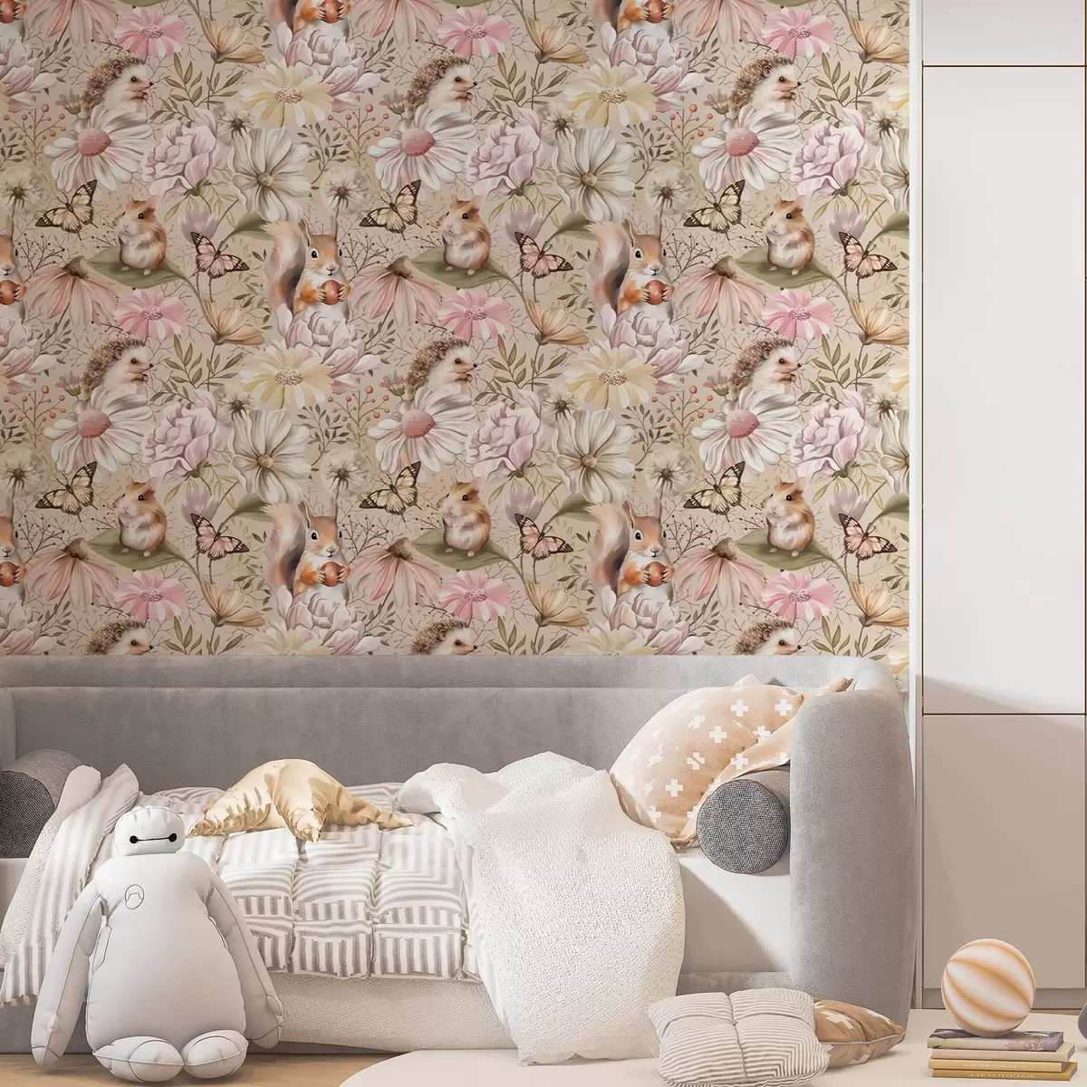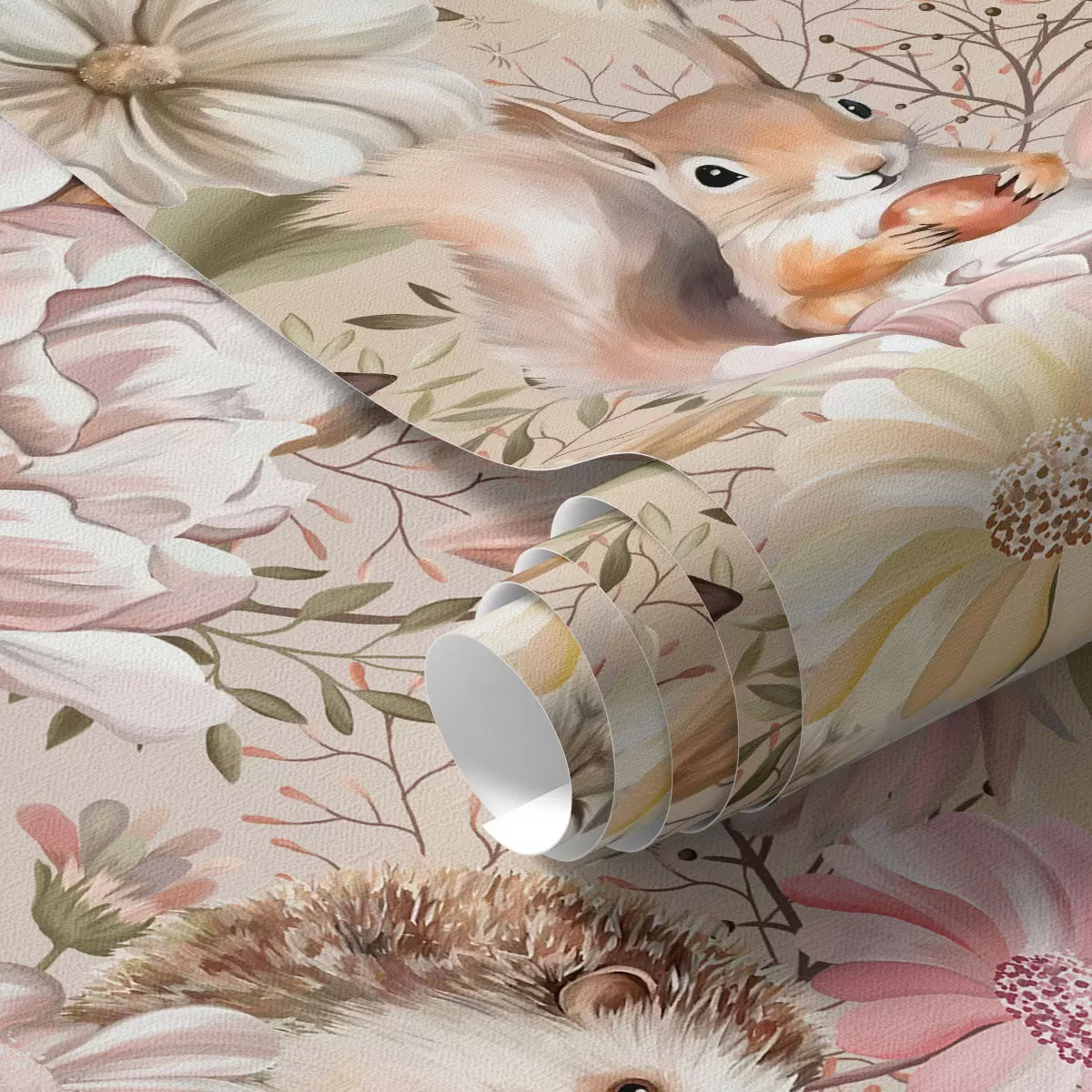 Papiers peints Hérisson, écureuil, hamster et papillons mignons avec des fleurs aux couleurs pastel Nr. a00051
