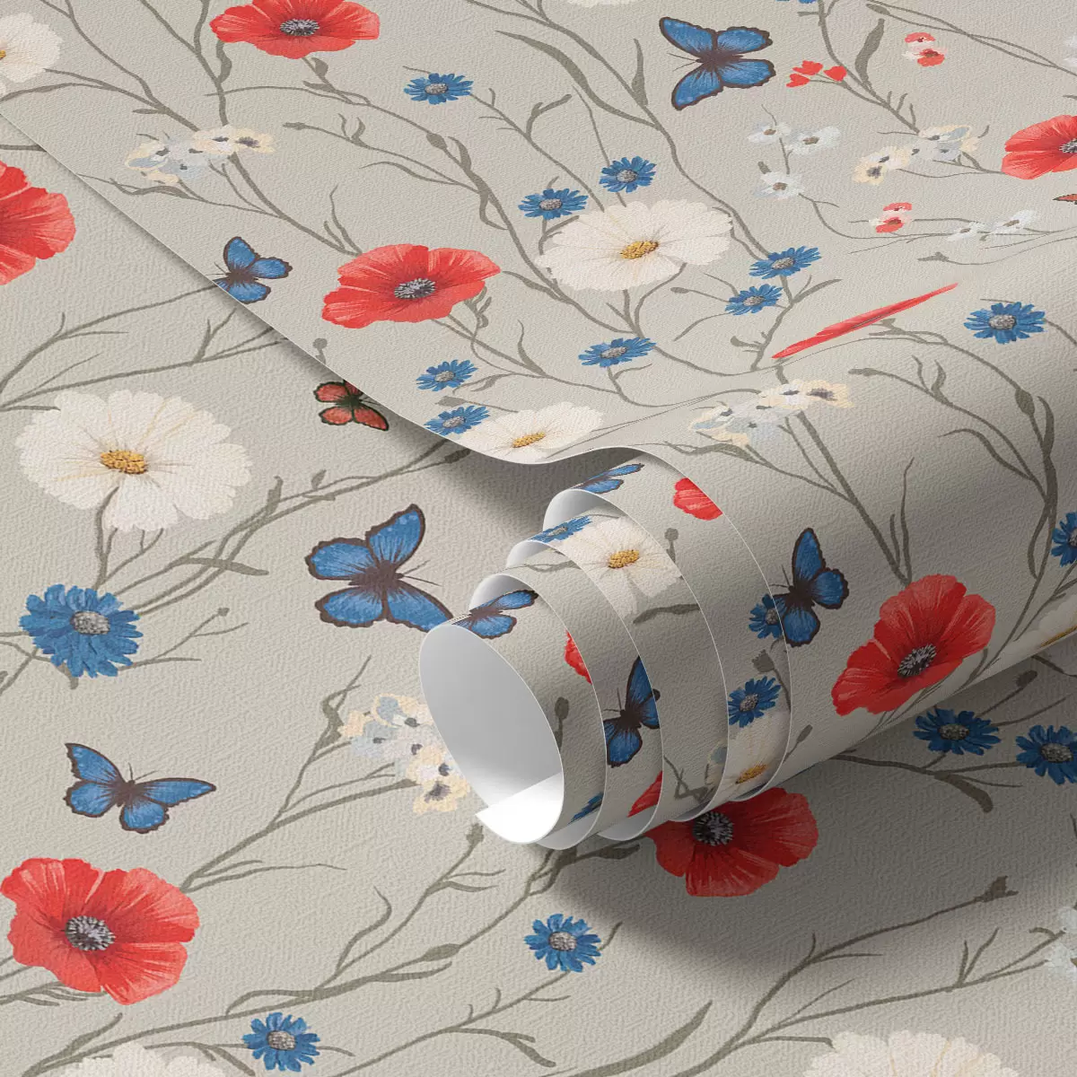 Papiers peints Coquelicots, marguerites et papillons sur fond gris clair Nr. a00072v1