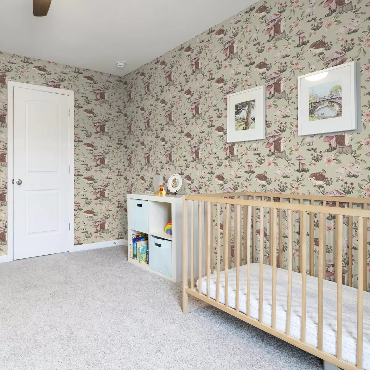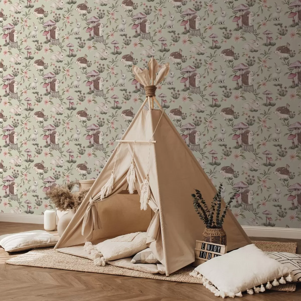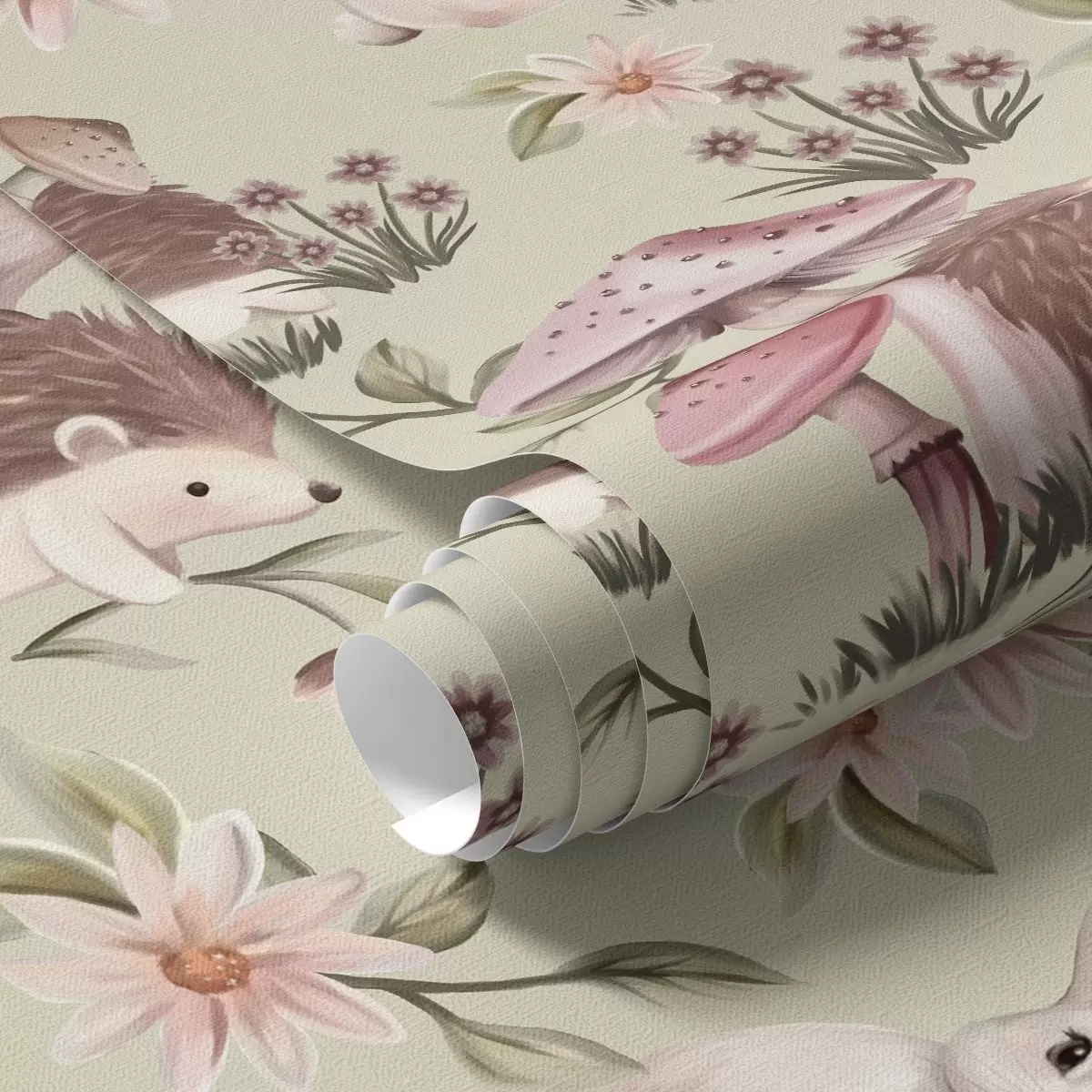 Papiers peints Animaux et fleurs de contes de fées sur un fond vert aux délicates couleurs pastel Nr. a00111v1