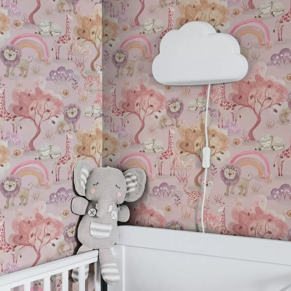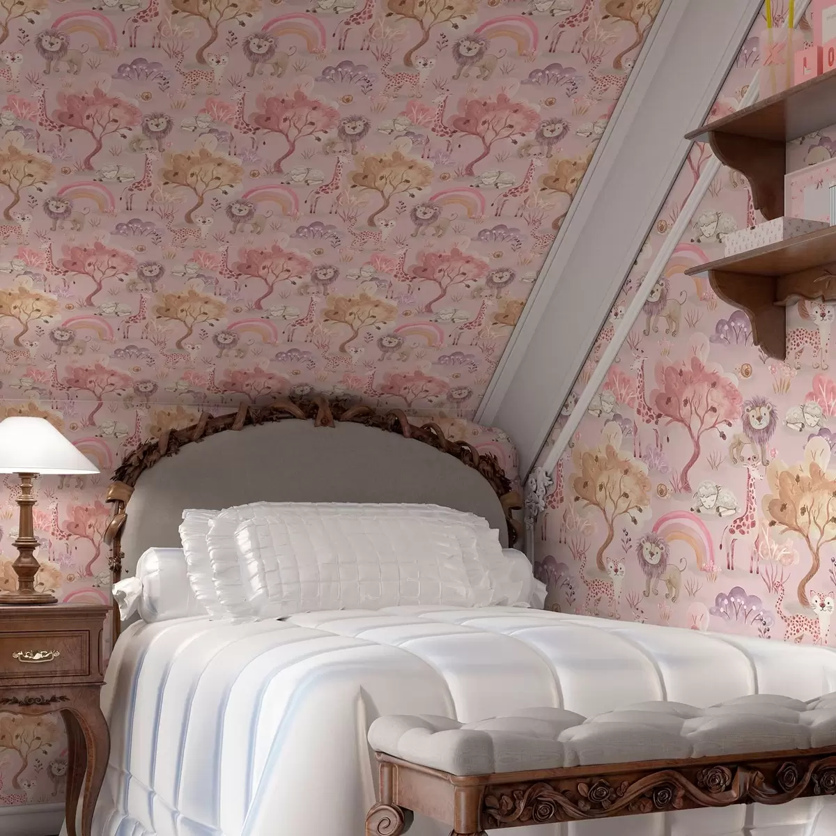 Papiers peints Lionceaux, girafes et arcs-en-ciel dans une forêt pastel Nr. a00112