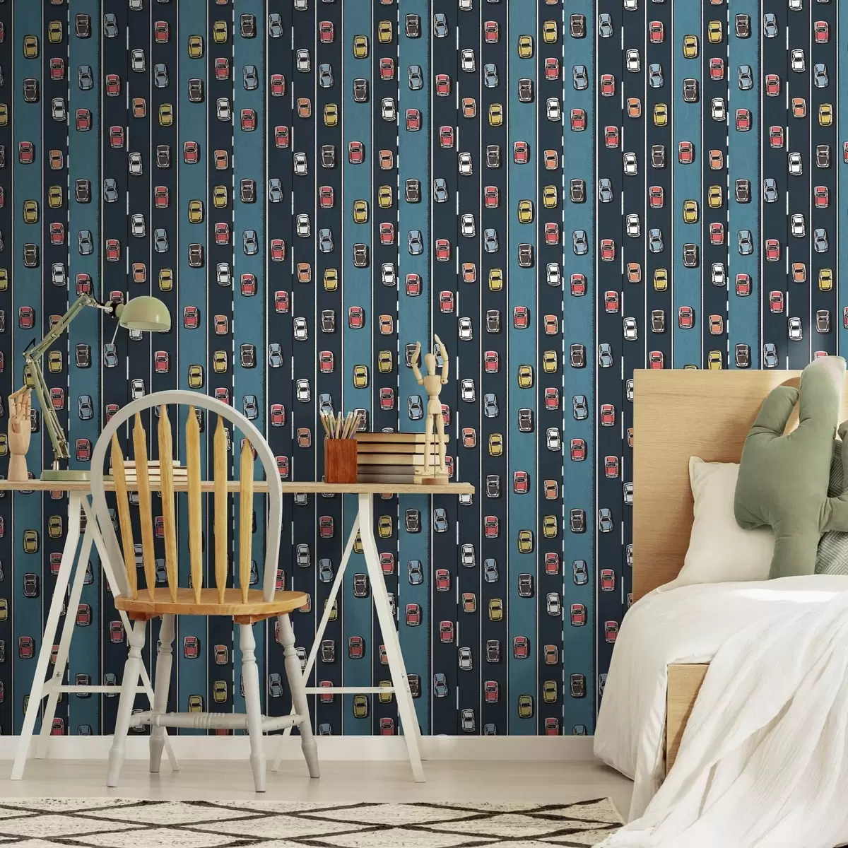 Papiers peints Voiture rétro sur une route bleu marine dans le style des années 60 Nr. a00118