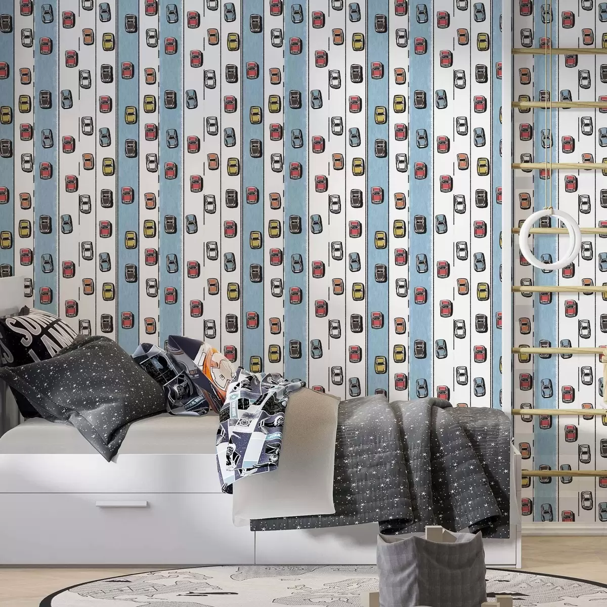 Papiers peints Voiture rétro sur une route blanche et bleue dans le style des années 60 Nr. a00118v2