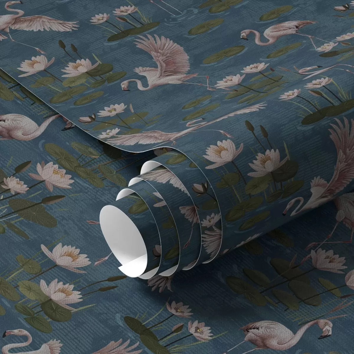 Papiers peints Flamant parmi les nénuphars, scène tropicale sur fond bleu marine Nr. a00237