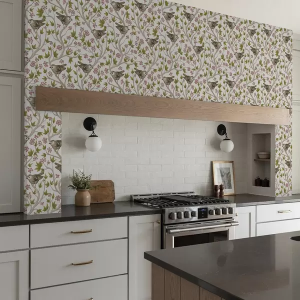 Papiers peints Oiseaux sur des branches avec des feuilles et des baies sur fond blanc Nr. a00283
