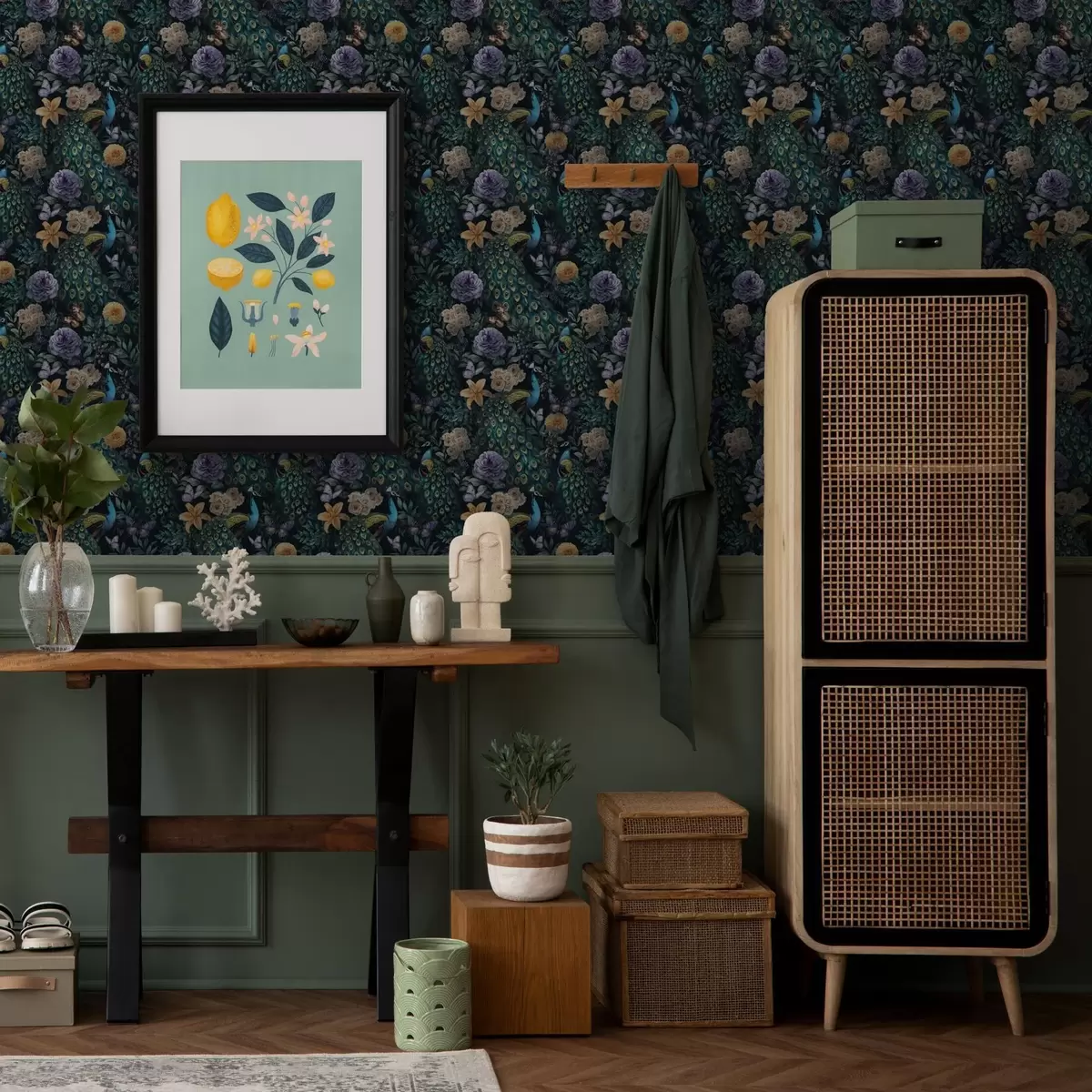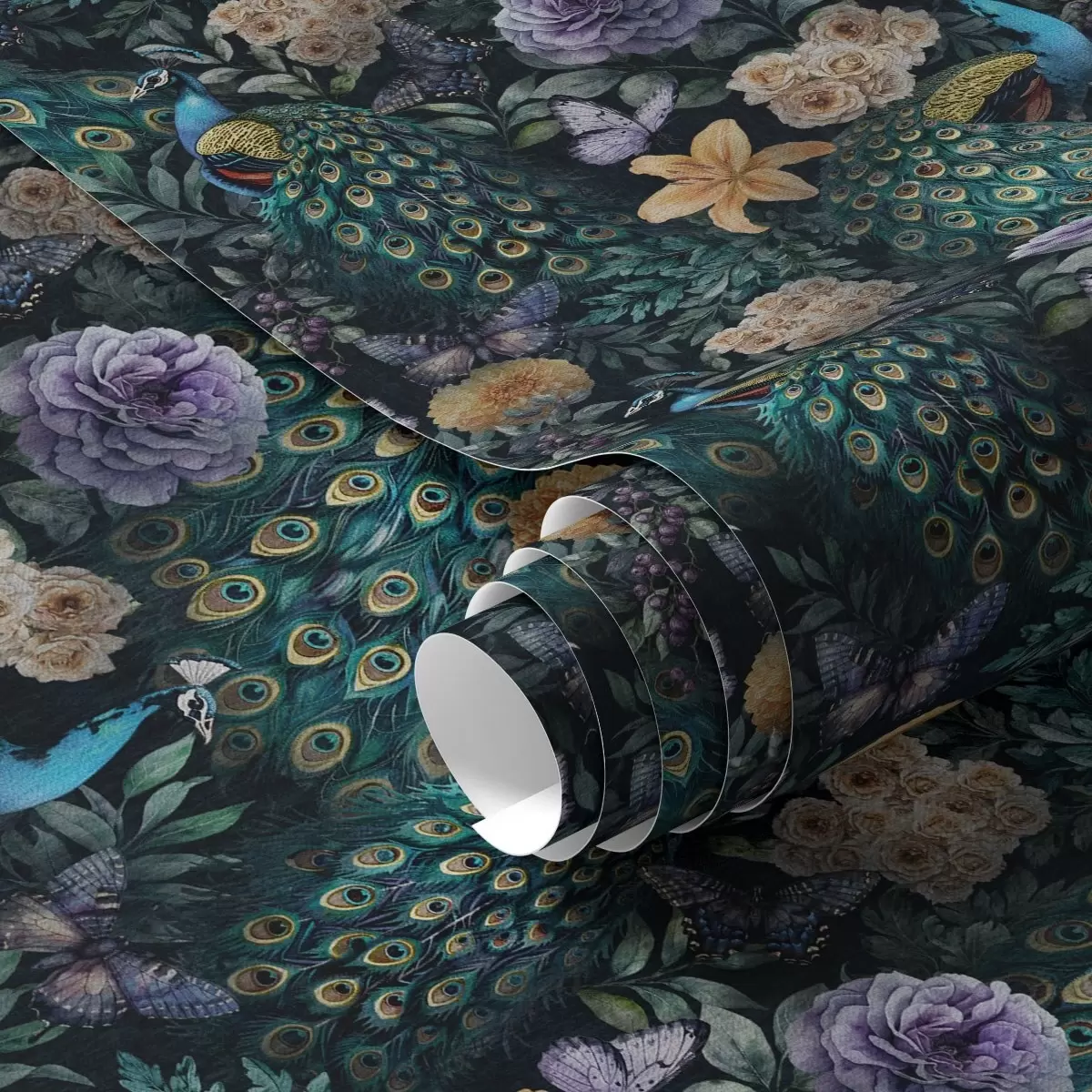 Papiers peints Paons parmi les fleurs sombres et les papillons Nr. a00348
