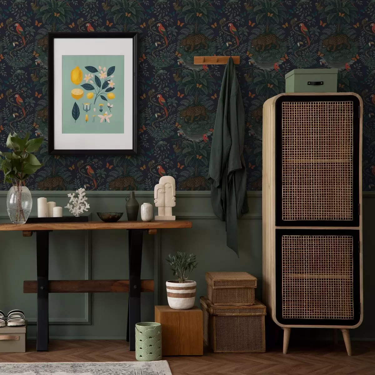 Papiers peints Jungle tropicale avec léopard, léopard, perroquets et papillons Nr. a00388
