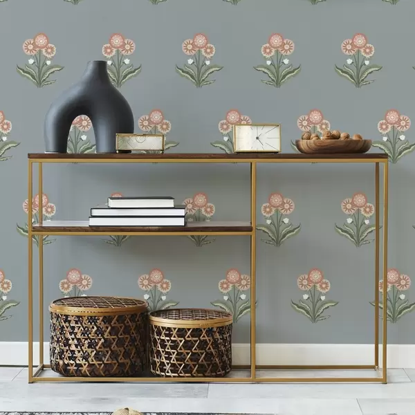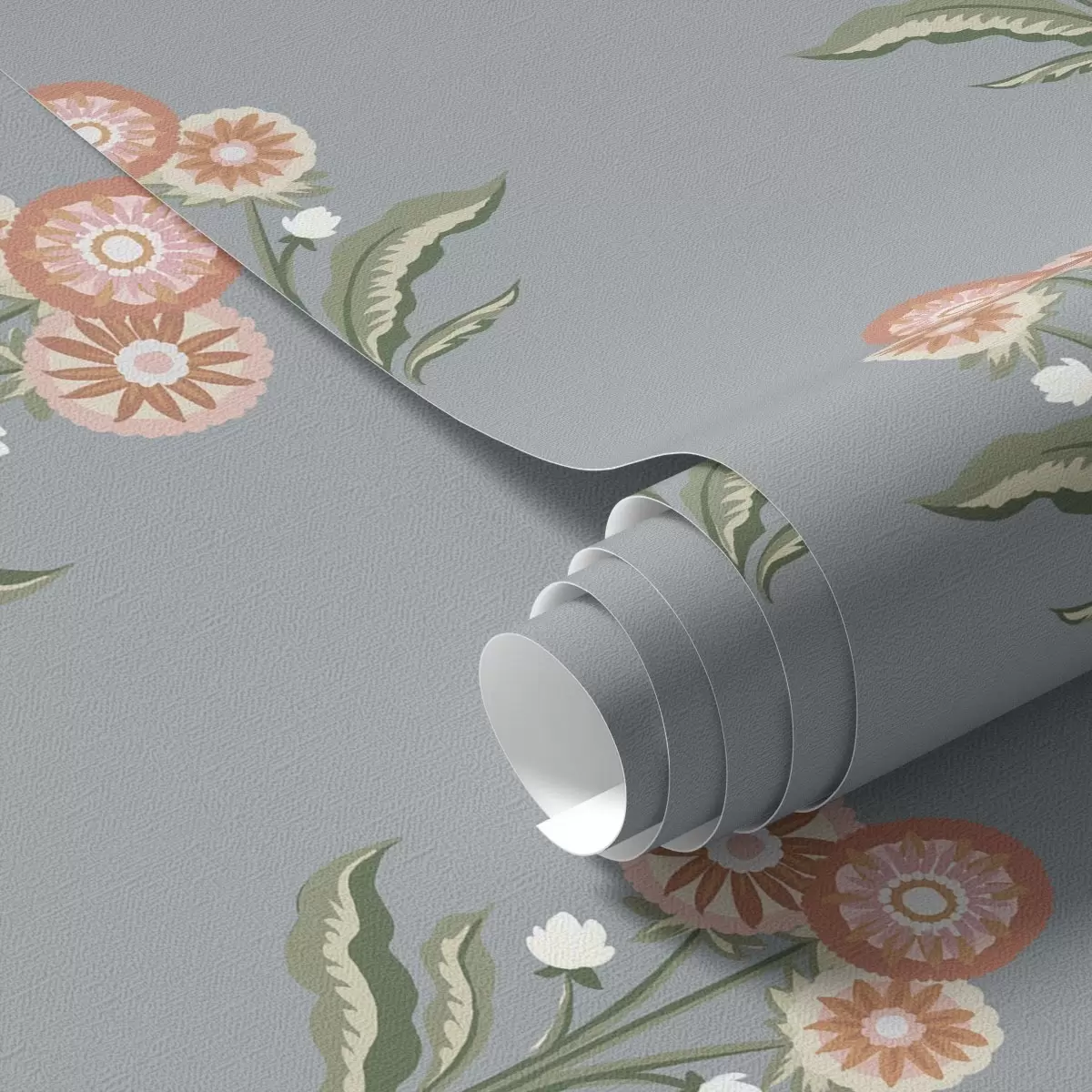 Papiers peints Fleurs stylisées sur fond gris-bleu, palette chaude Nr. a00494