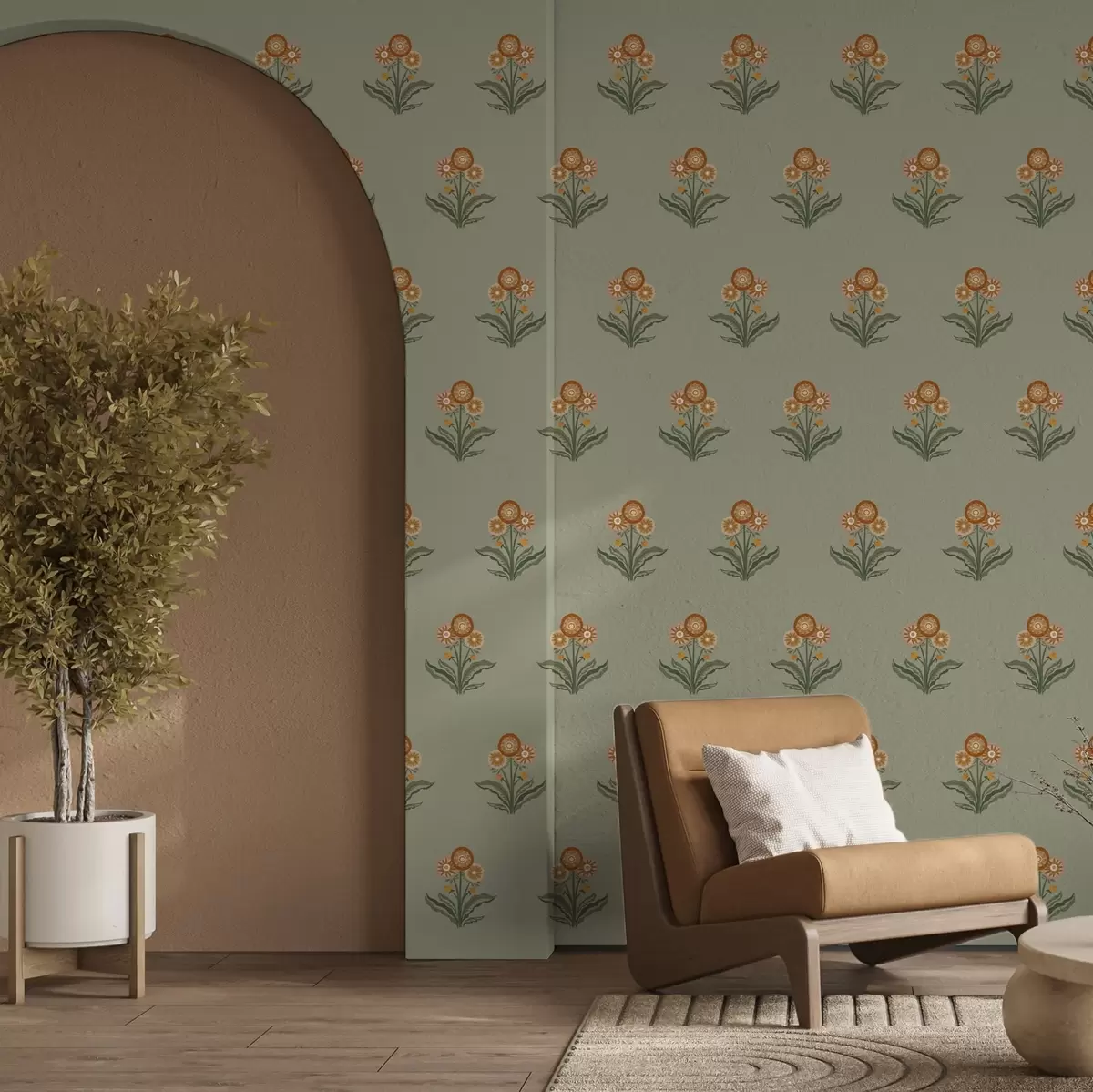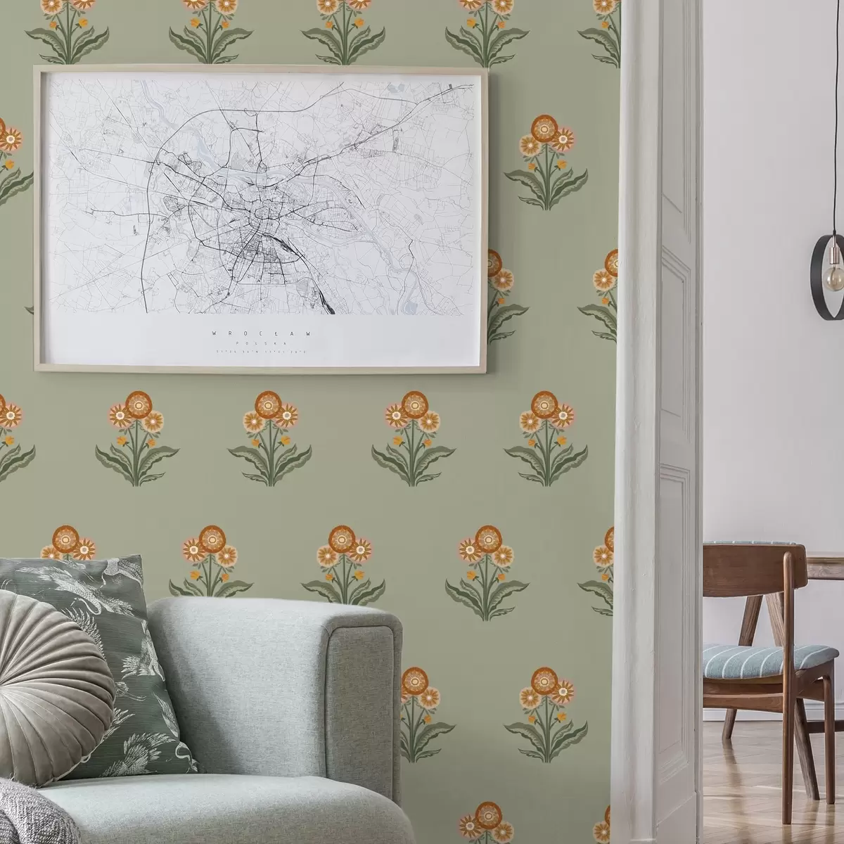 Papiers peints Fleurs stylisées sur fond olive, tons chauds Nr. a00494v2