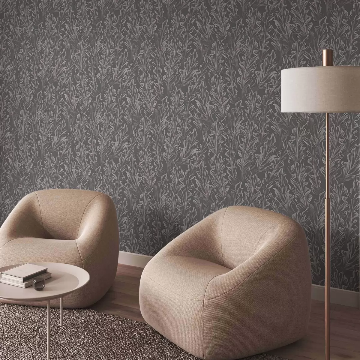 Papiers peints Vagues feuillues fluides sur fond graphite, contraste élevé Nr. a00495v1