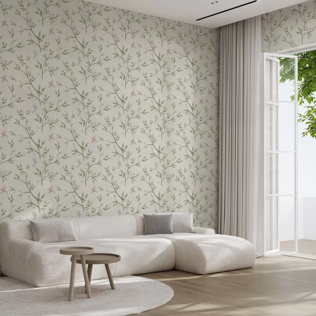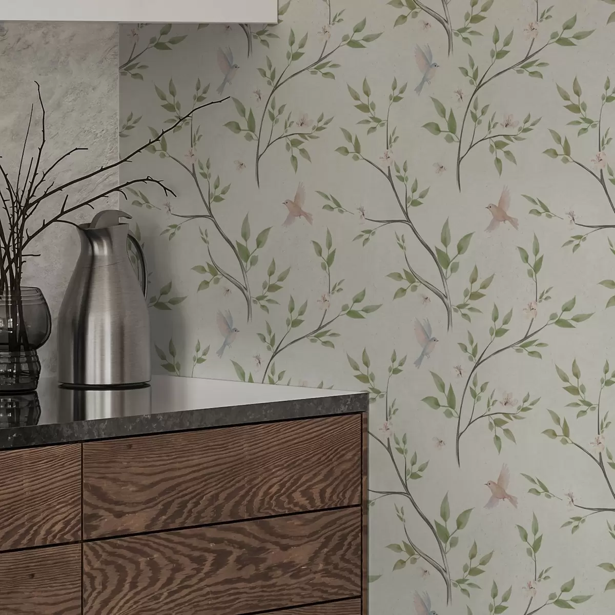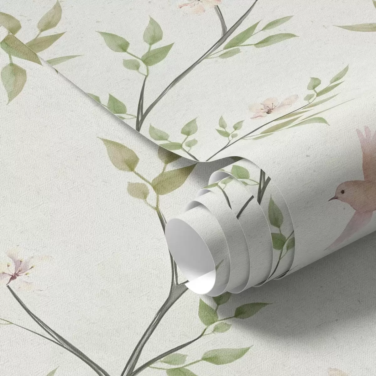 Papiers peints Branches aquarellées avec feuilles et oiseaux sur fond clair Nr. a00496