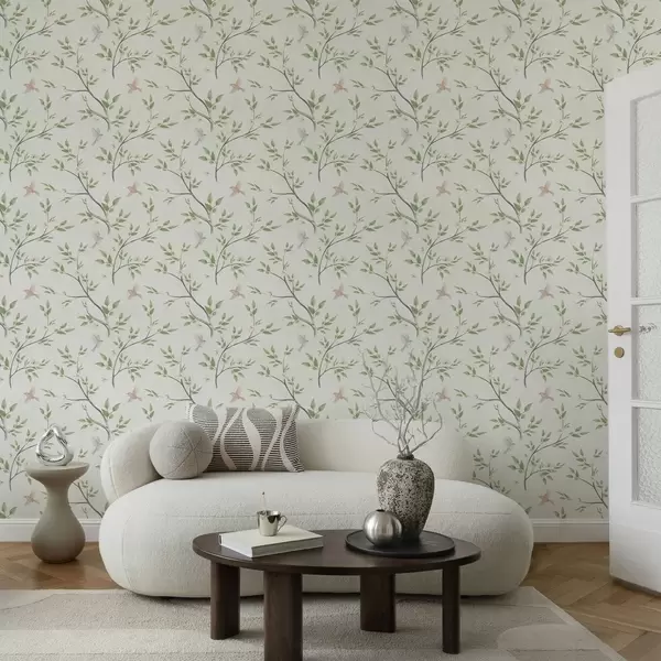 Papiers peints Branches aquarellées avec feuilles et oiseaux sur fond clair Nr. a00496