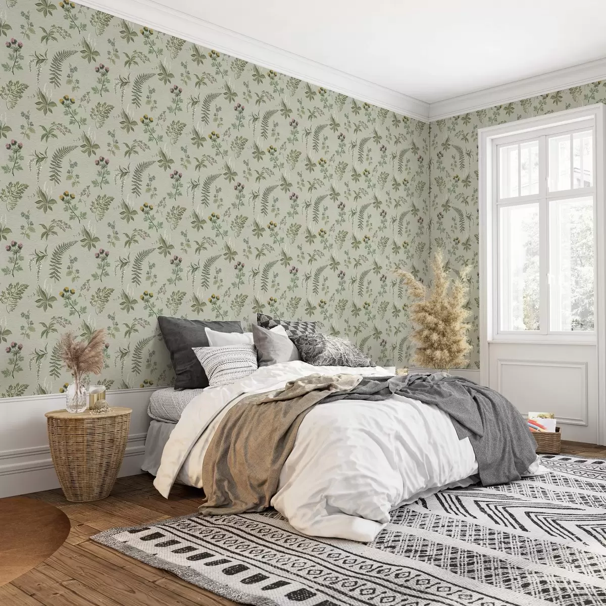 Papiers peints Herbes botaniques et fougères sur fond gris-vert pâle Nr. a00498
