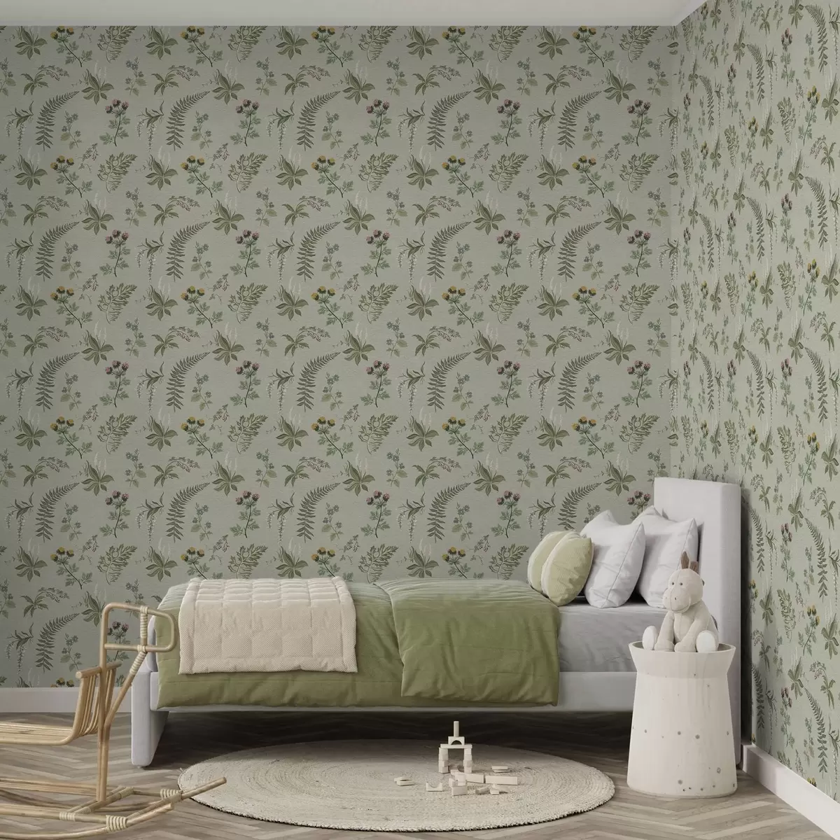 Papiers peints Herbes botaniques et fougères sur fond gris-vert pâle Nr. a00498