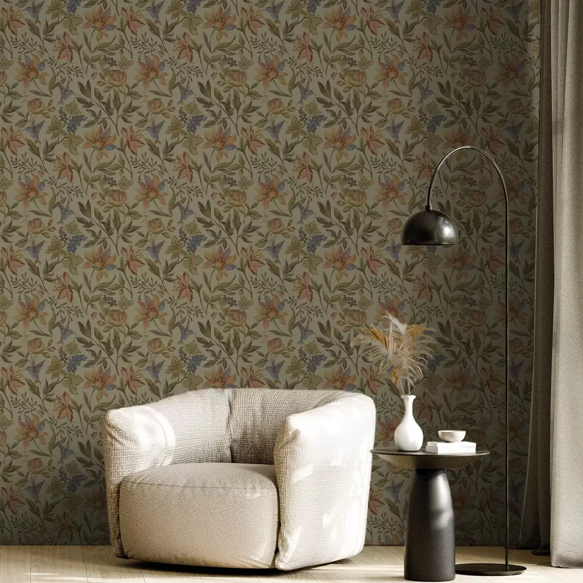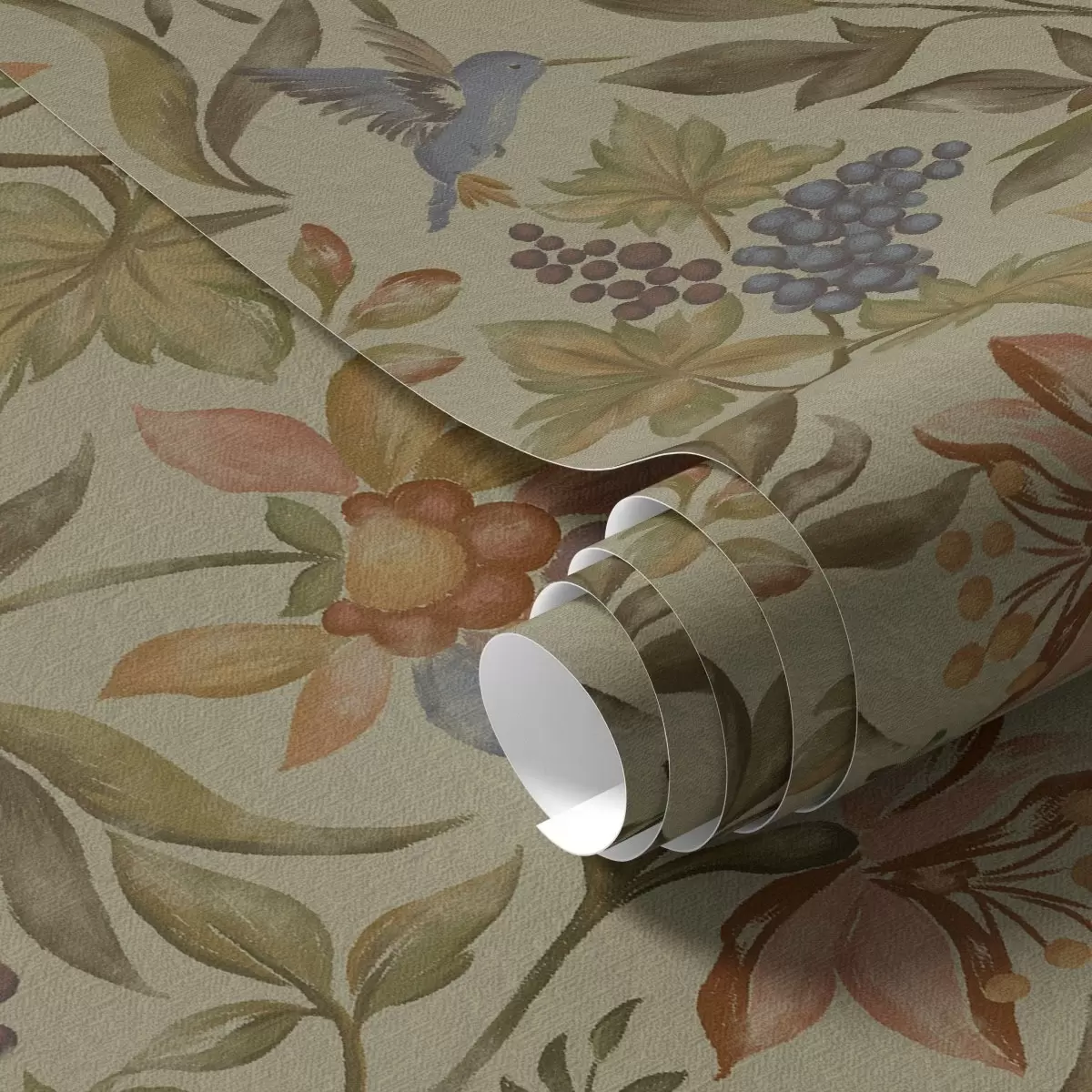 Papiers peints Fleurs et oiseaux vintage avec des raisins sur fond olive Nr. a00594