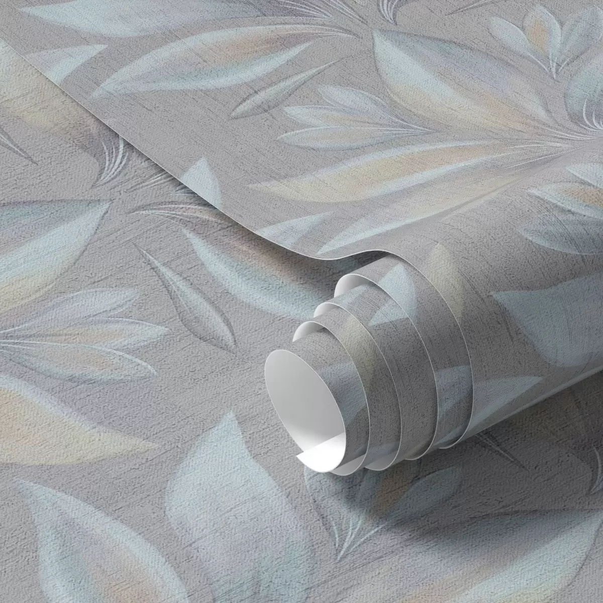 Papiers peints Grandes feuilles stylisées dans une palette bleu sable sur fond gris Nr. a00601
