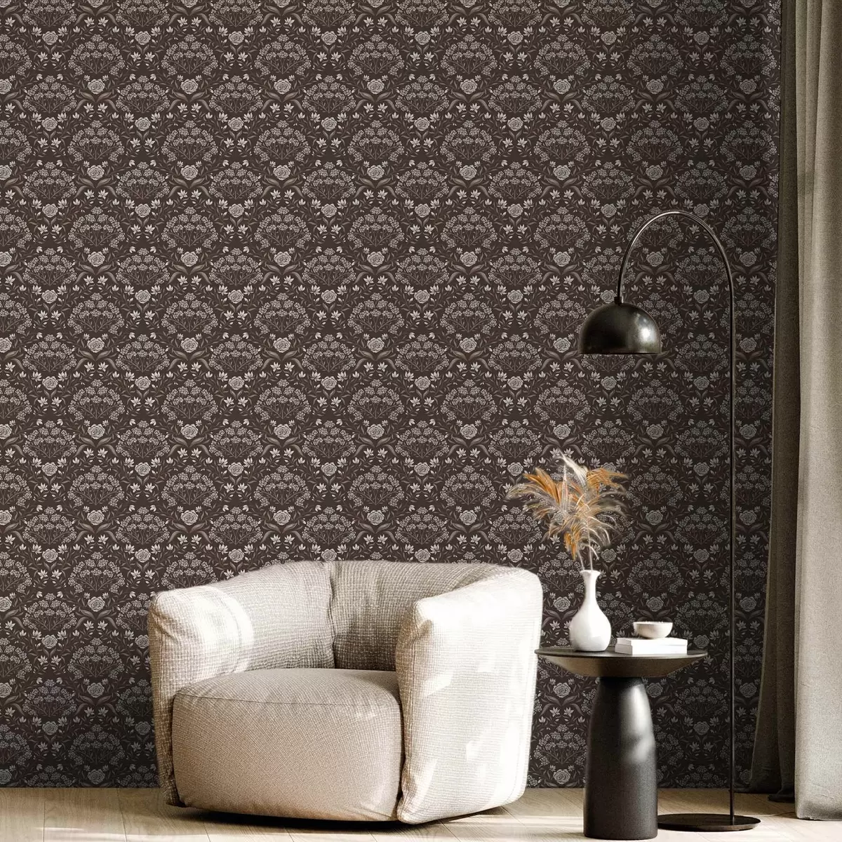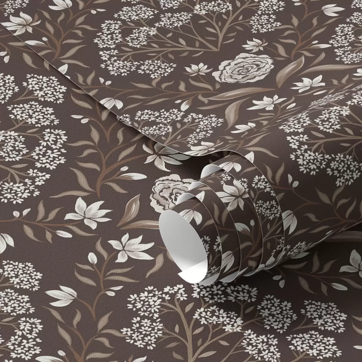 Papiers peints Damassé chocolat noir avec pivoines et perce-neige Nr. a00603v2