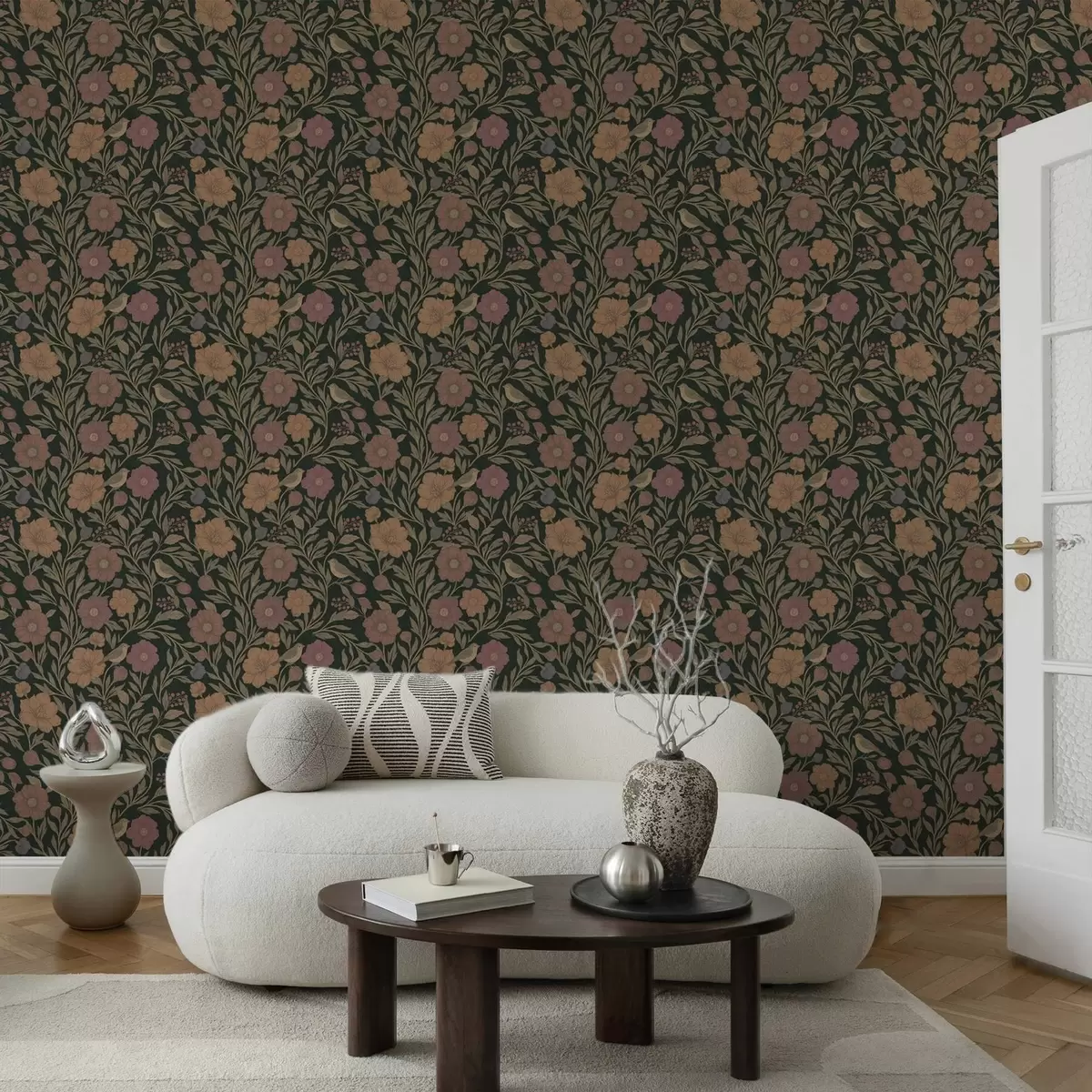 Papiers peints Fleurs d'automne et oiseaux sur fond émeraude profond Nr. a00605v1