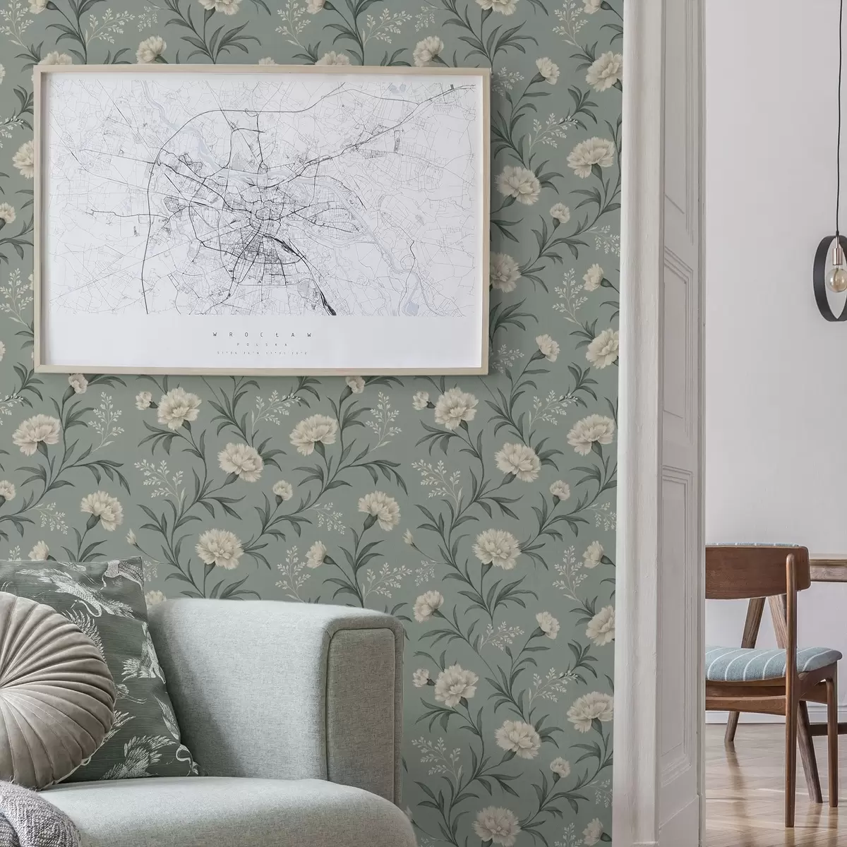 Papiers peints Des œillets poudrés sur fond gris-bleu sarcelle, imprimé raffiné Nr. a00610