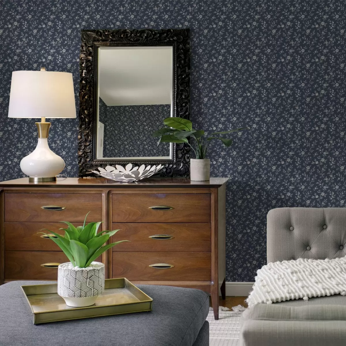 Papiers peints Fond bleu marine foncé avec de fines branches et fleurs beiges Nr. a00612