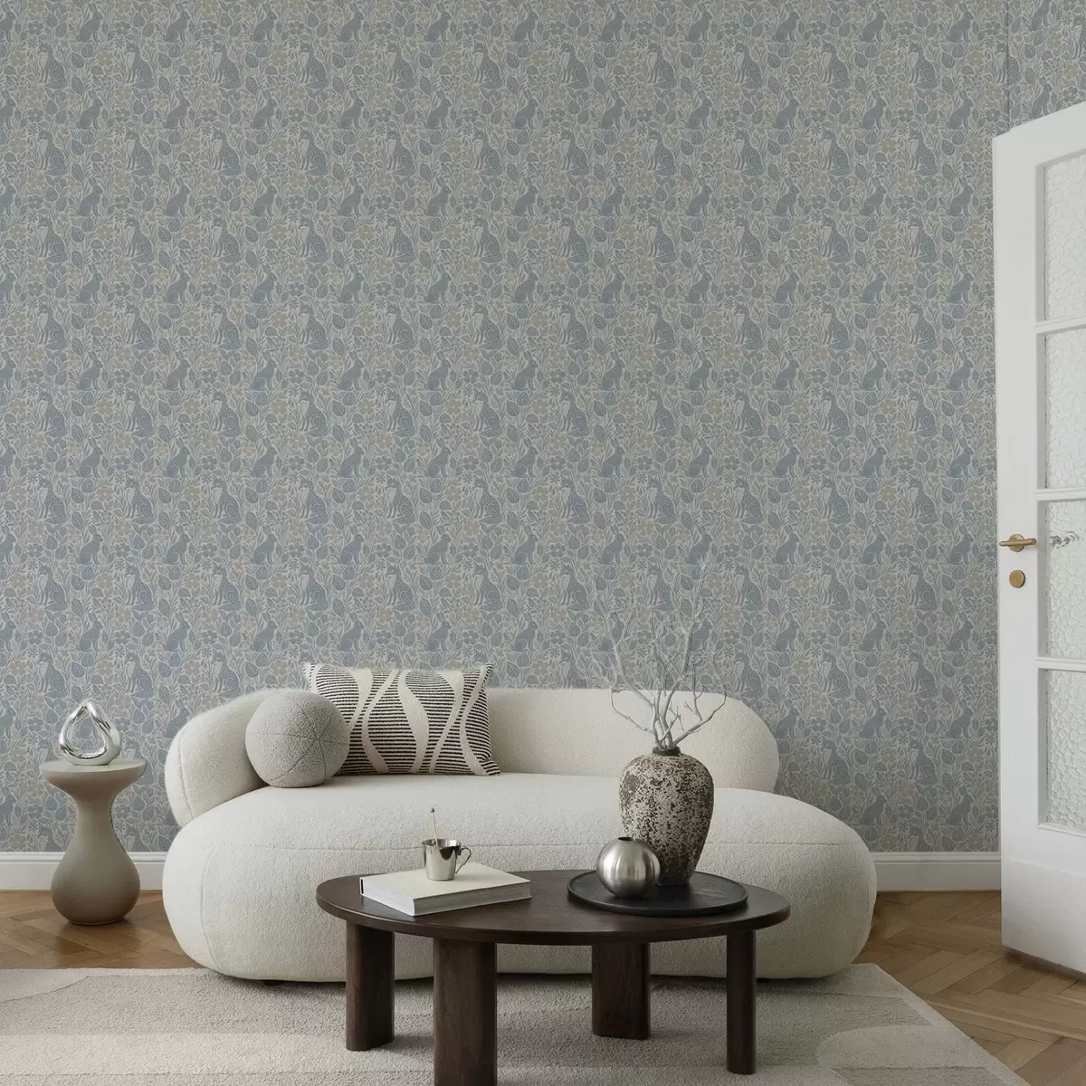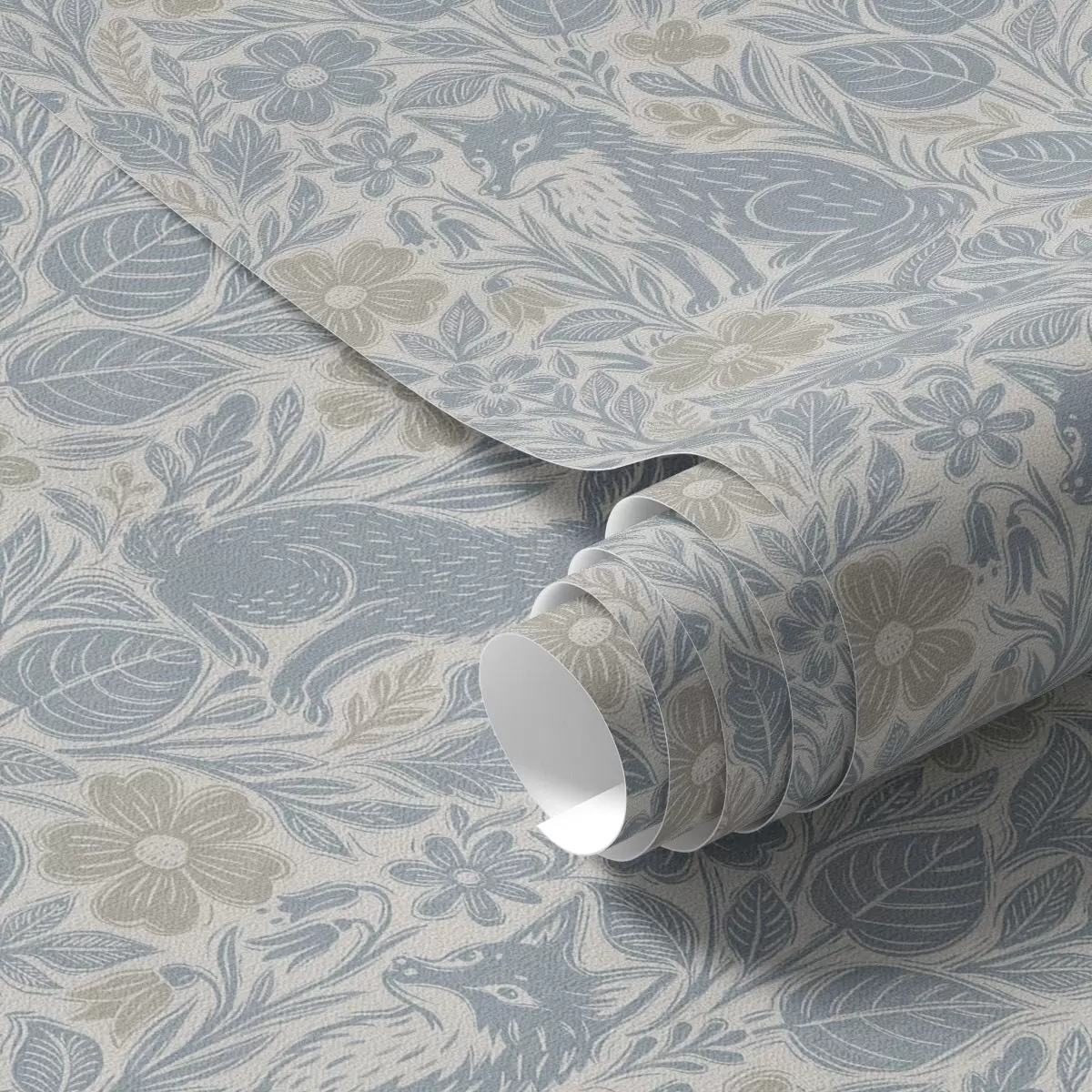 Papiers peints Animaux et fleurs de la forêt : renard et lièvre dans des tons bleus Nr. a00613
