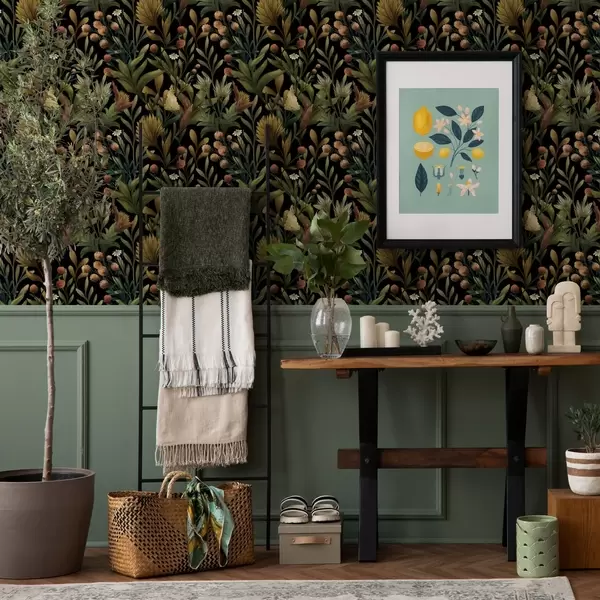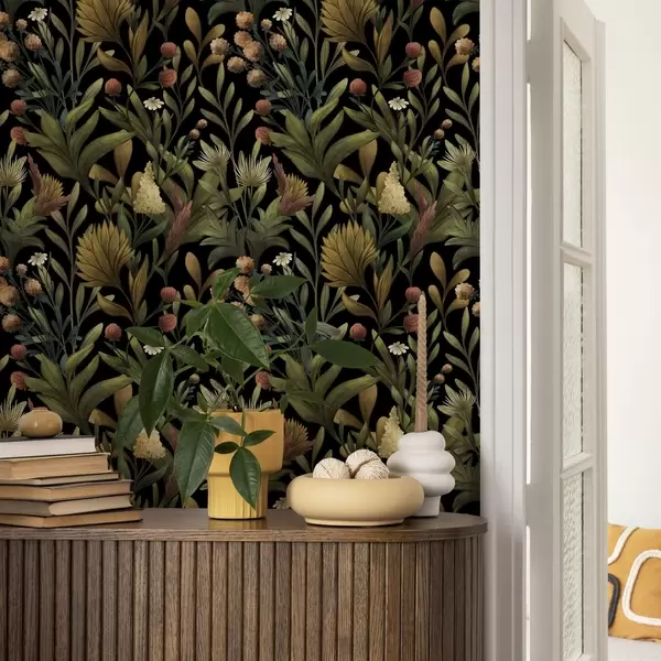 Papiers peints Jardin botanique sur fond noir, palette automnale chaleureuse Nr. a00619