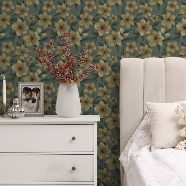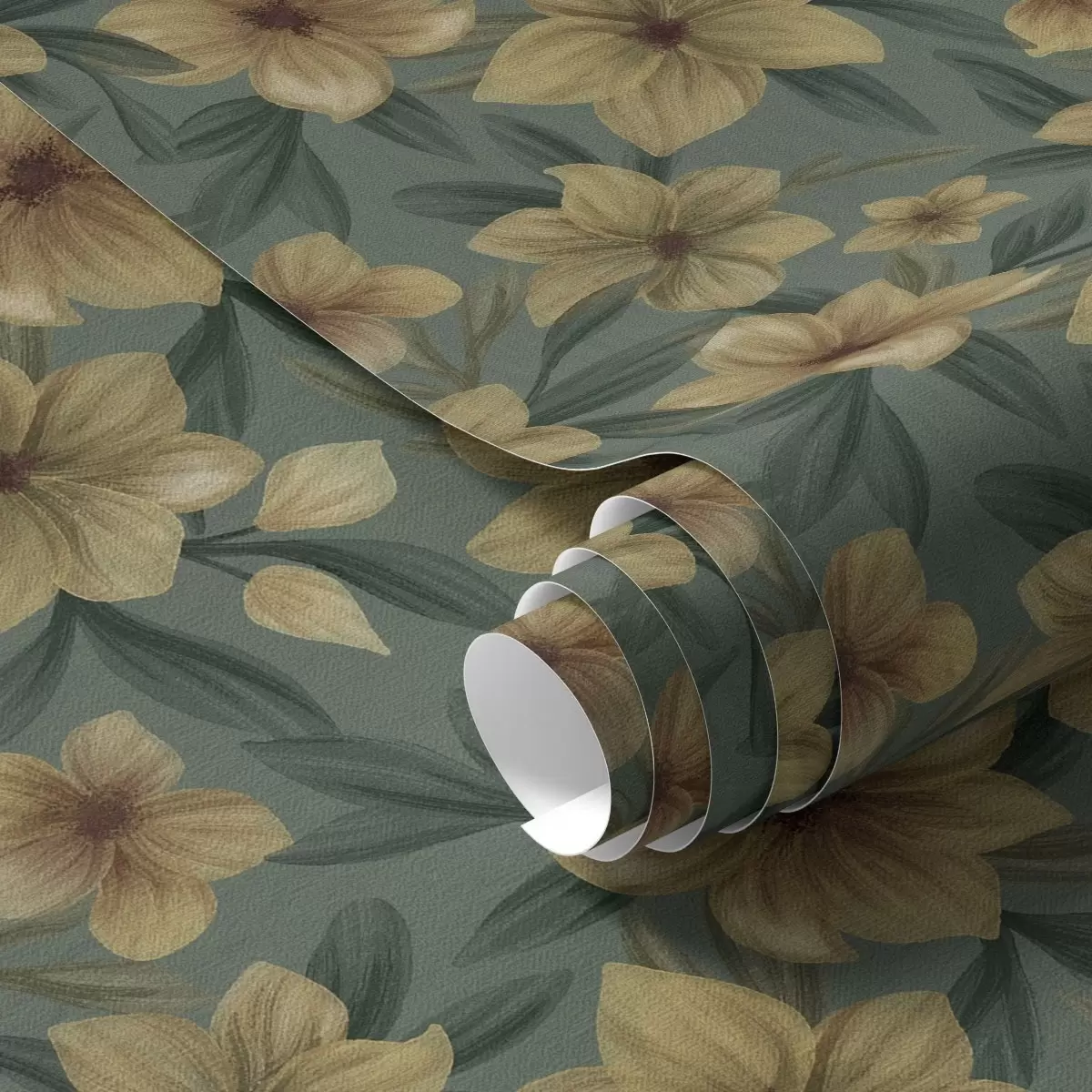 Papiers peints Fleurs ocres sur fond vert foncé, motif dense Nr. a00628