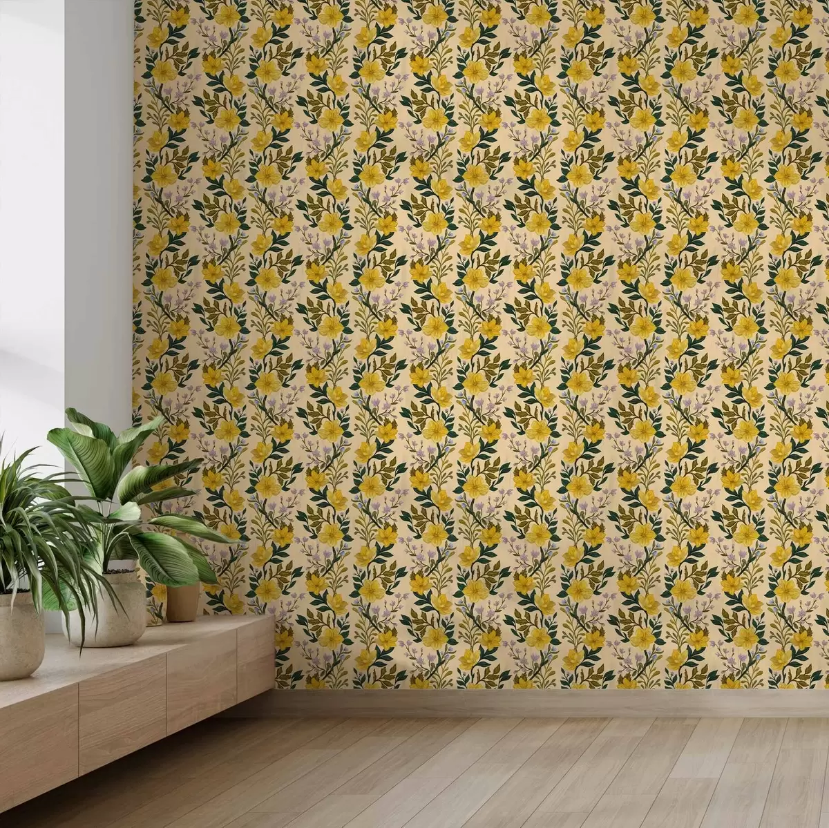 Papiers peints Fleurs jaunes disposées en guirlandes verticales sur fond crème Nr. a00632