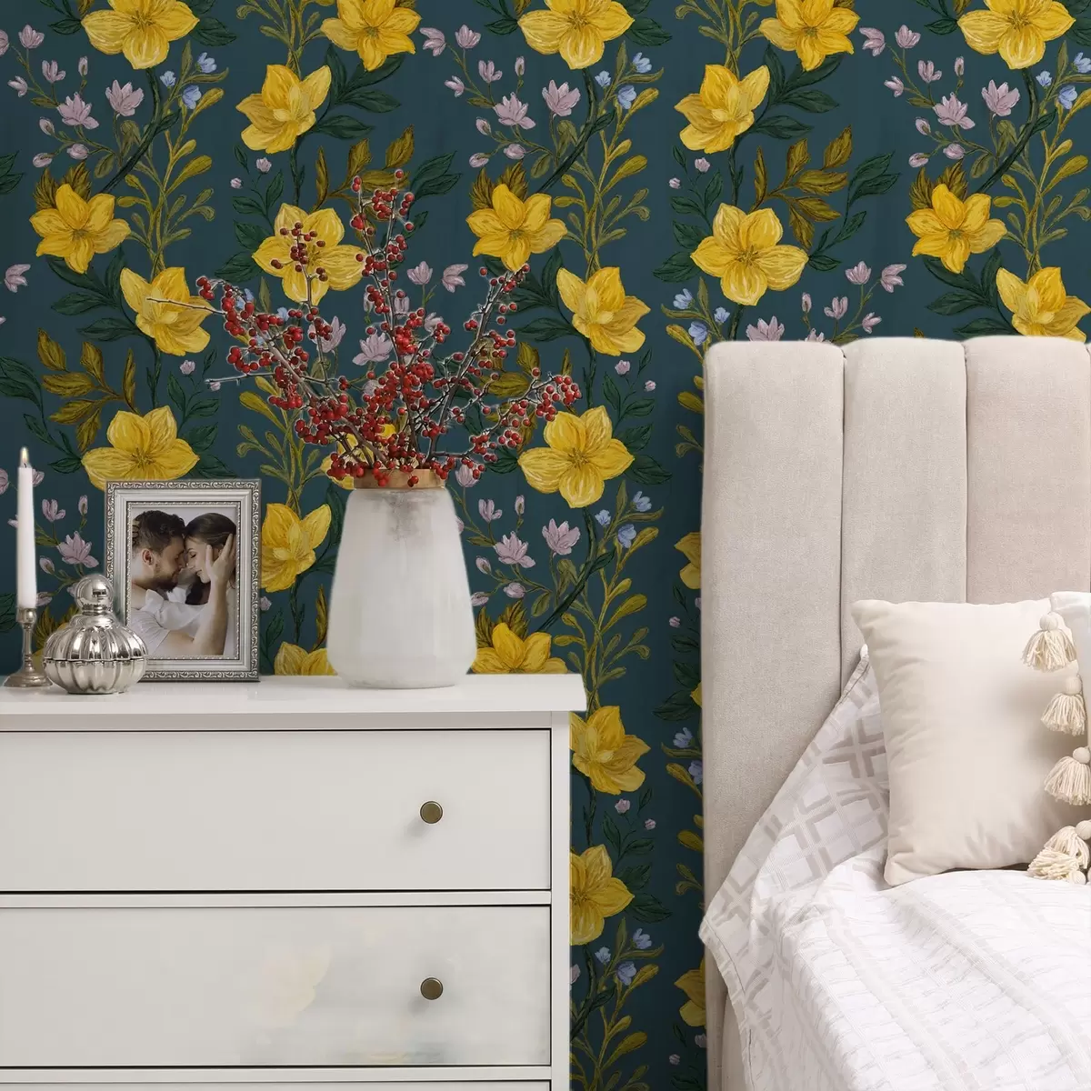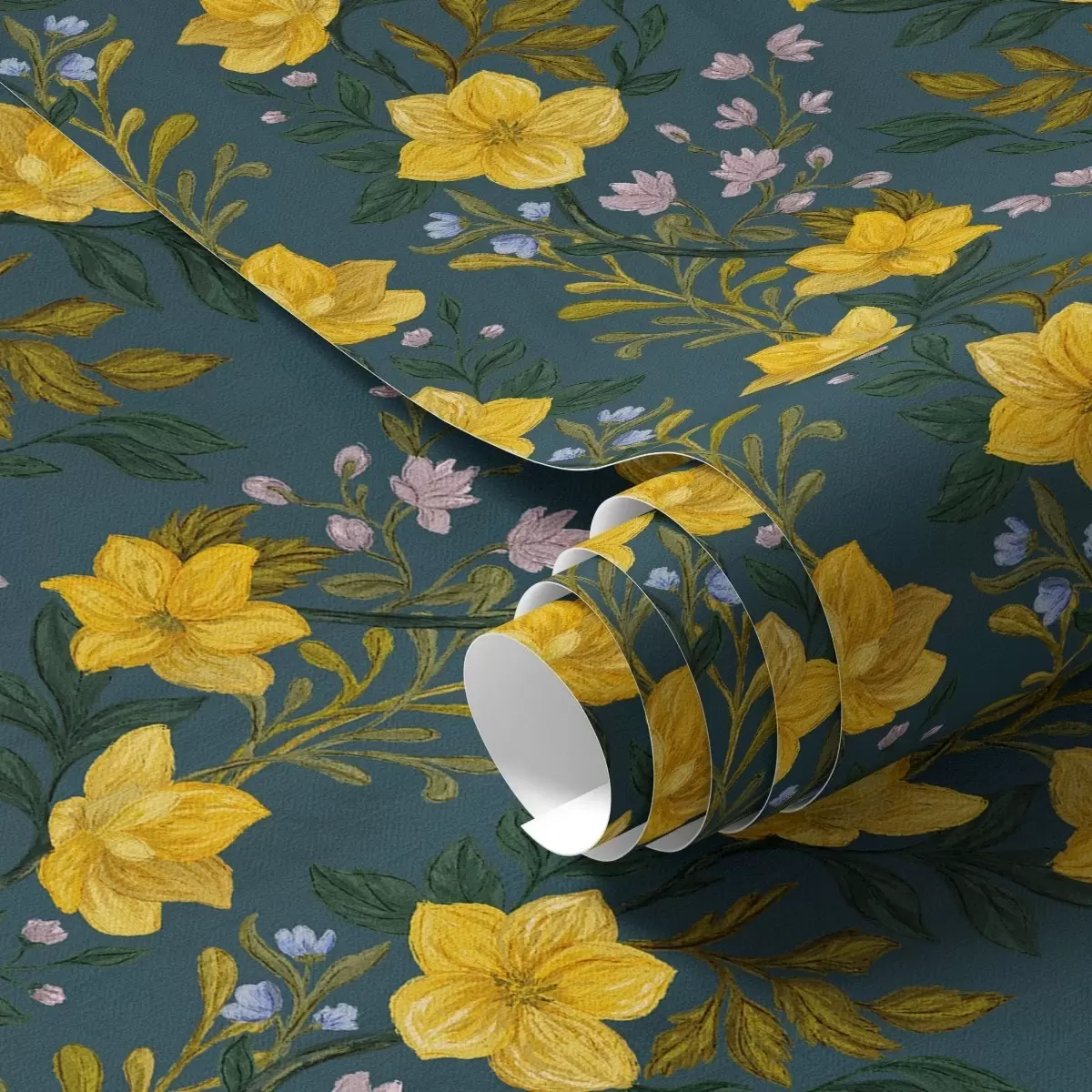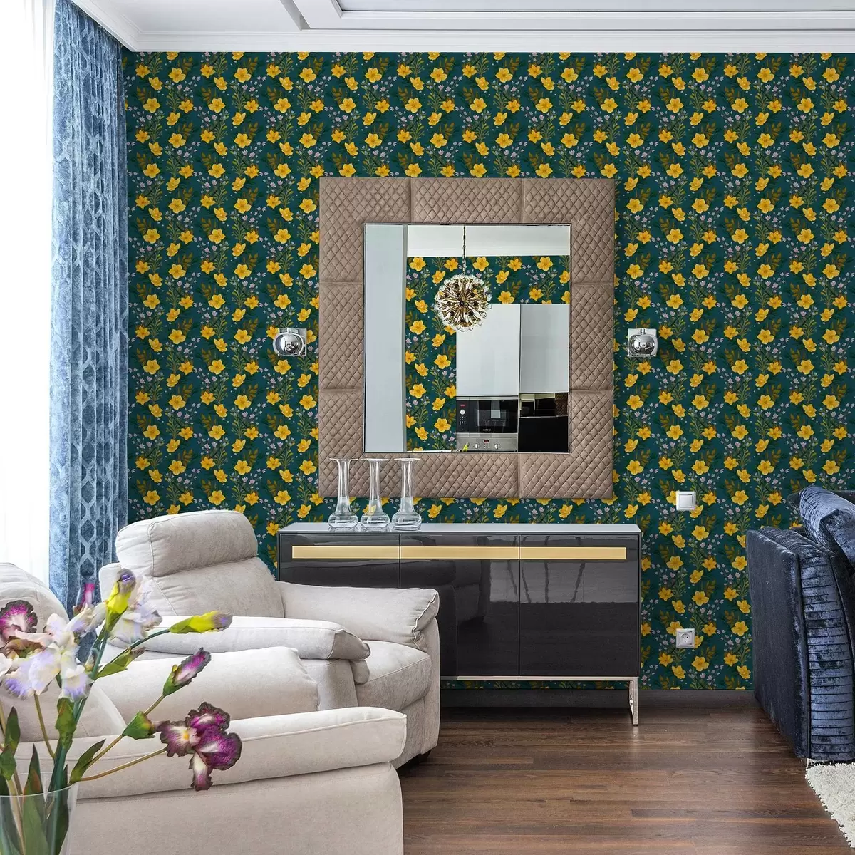 Papiers peints Fleurs jaunes en guirlandes verticales sur fond bleu foncé Nr. a00632v2