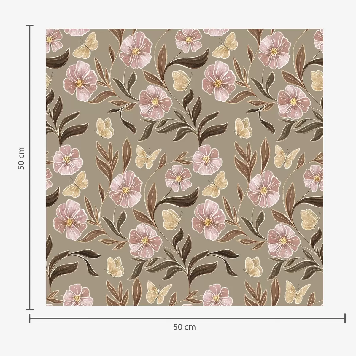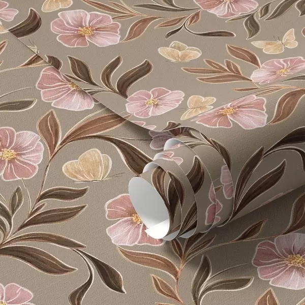 Papiers peints Fleurs roses et papillons sur fond beige olive Nr. a00633v2