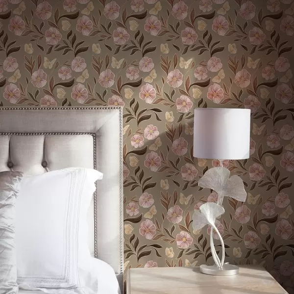 Papiers peints Fleurs roses et papillons sur fond beige olive Nr. a00633v2