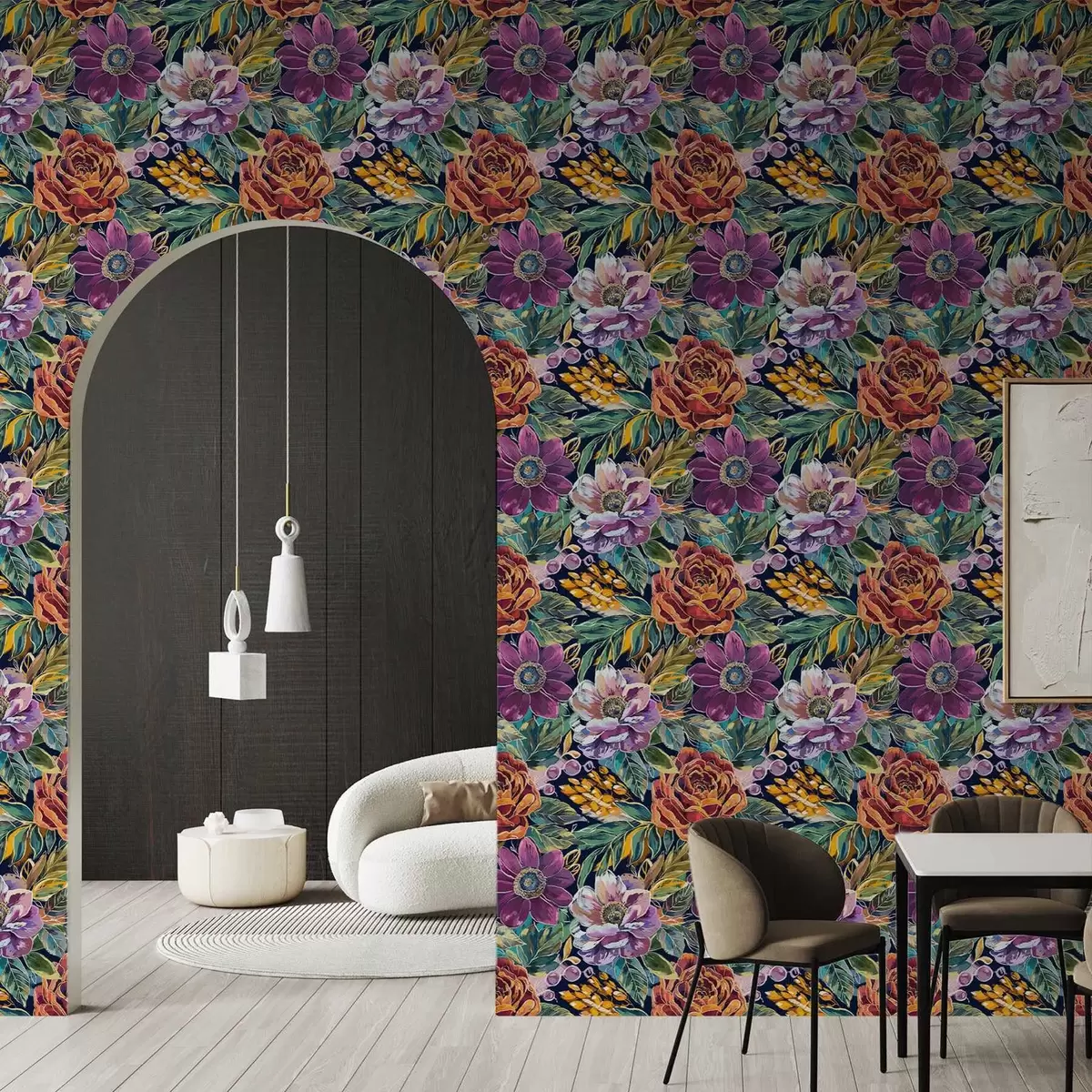 Papiers peints De grandes fleurs peintes au pinceau sur un fond bleu foncé Nr. a00643