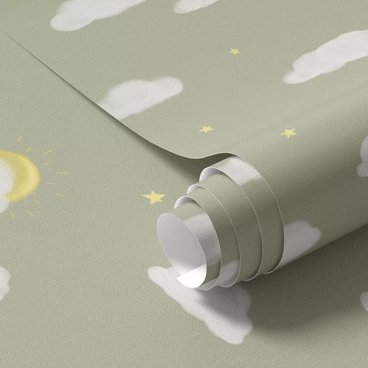 Papiers peints Nuages cotonneux, étoiles et soleil sur fond gris verdâtre Nr. a00652v1