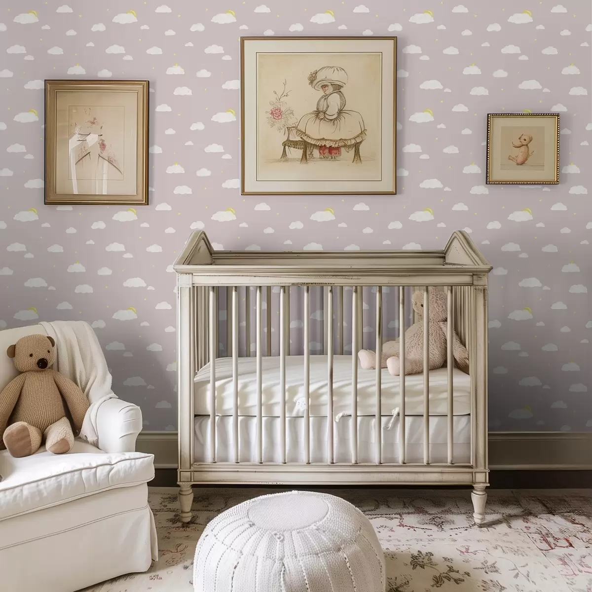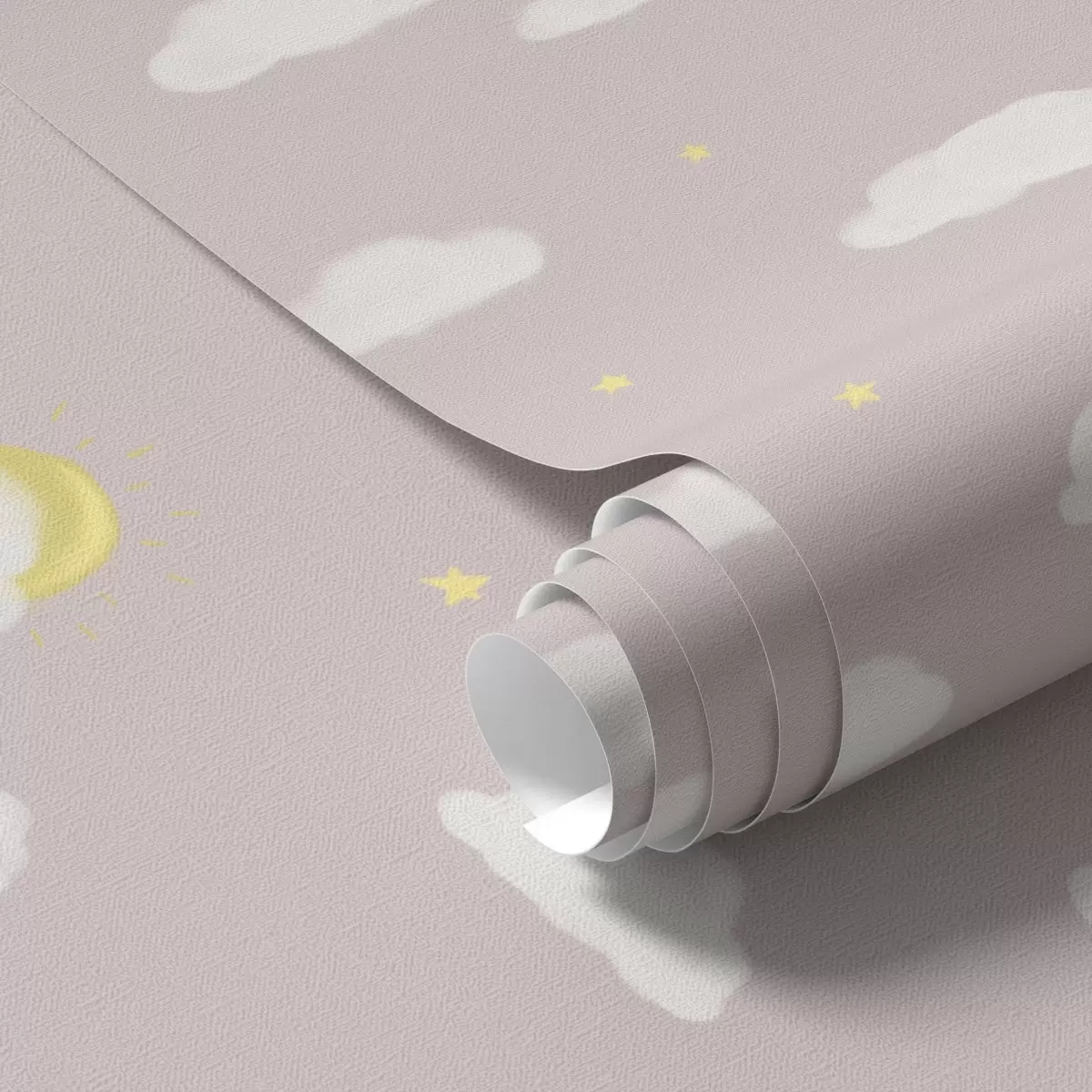 Papiers peints Nuages cotonneux, étoiles et soleil sur fond gris rosé Nr. a00652v2