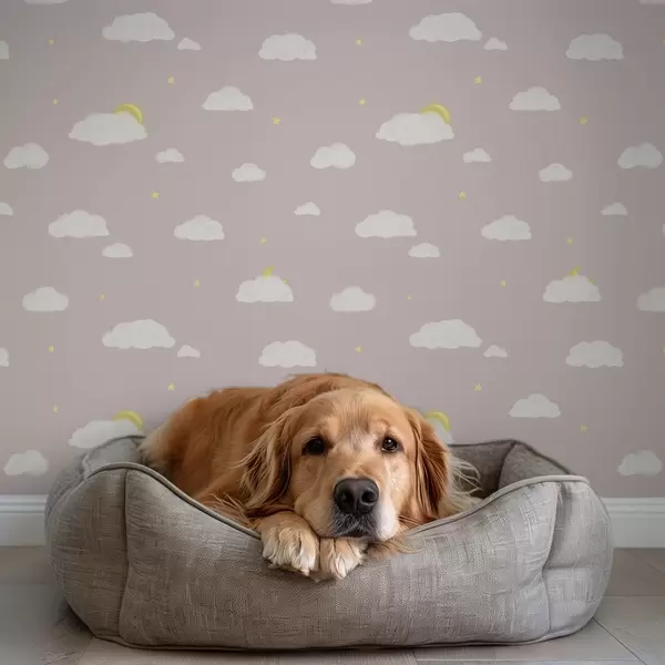 Papiers peints Nuages cotonneux, étoiles et soleil sur fond gris rosé Nr. a00652v2