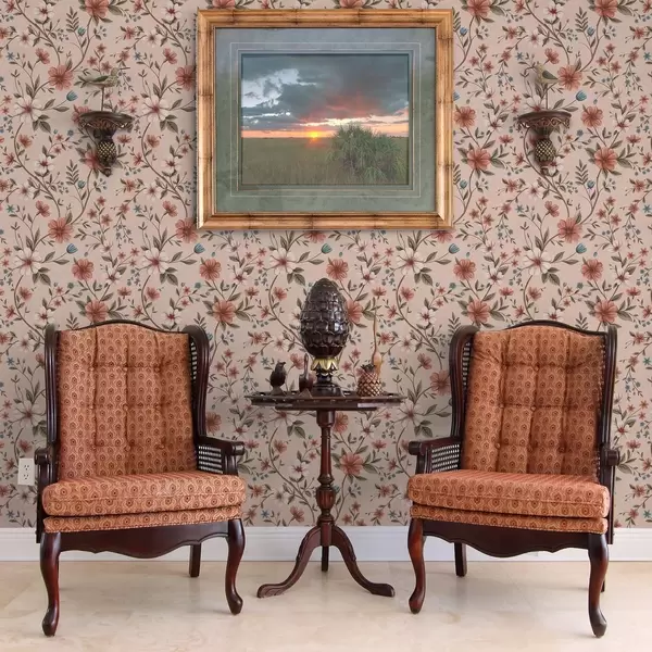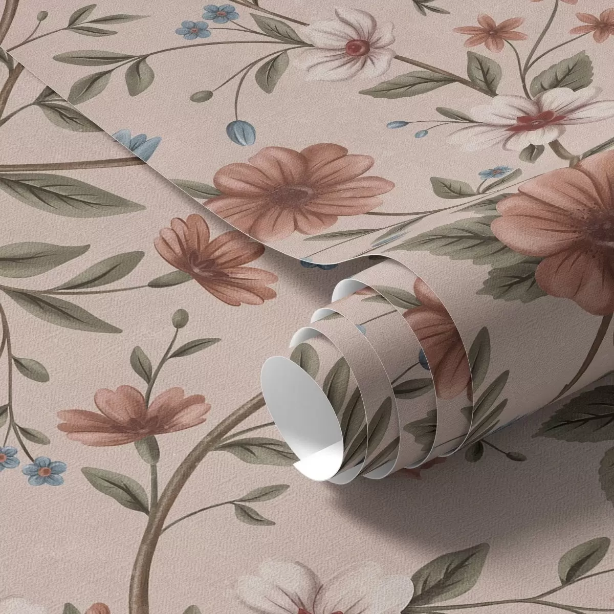 Papiers peints Fleurs et feuillage rose corail sur fond rose poudré Nr. a00667