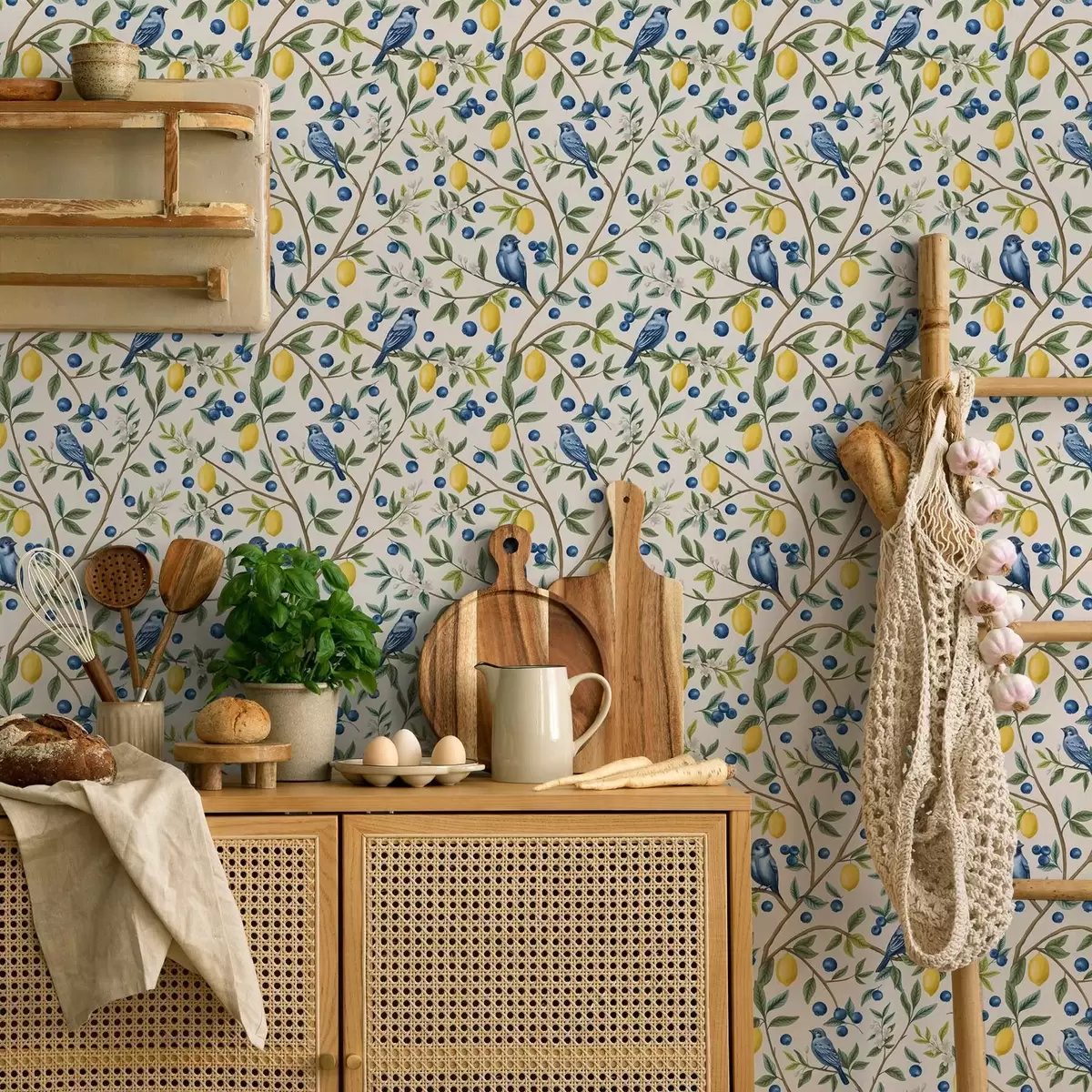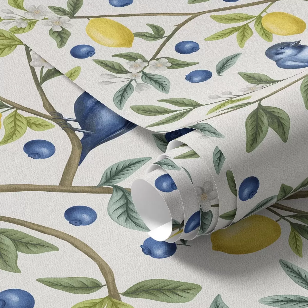 Papiers peints Oiseaux bleus, citrons et baies sur fond blanc Nr. a00668