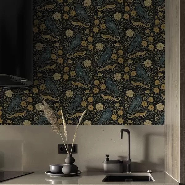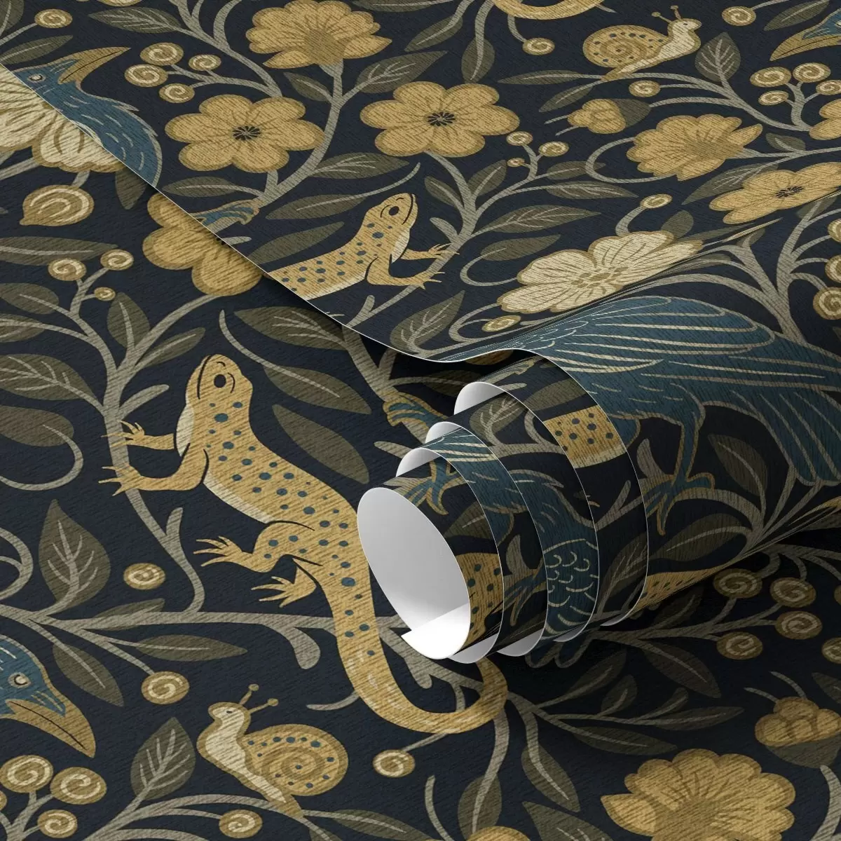Papiers peints Oiseaux, lézards et escargots parmi les fleurs sur fond sombre Nr. a00691
