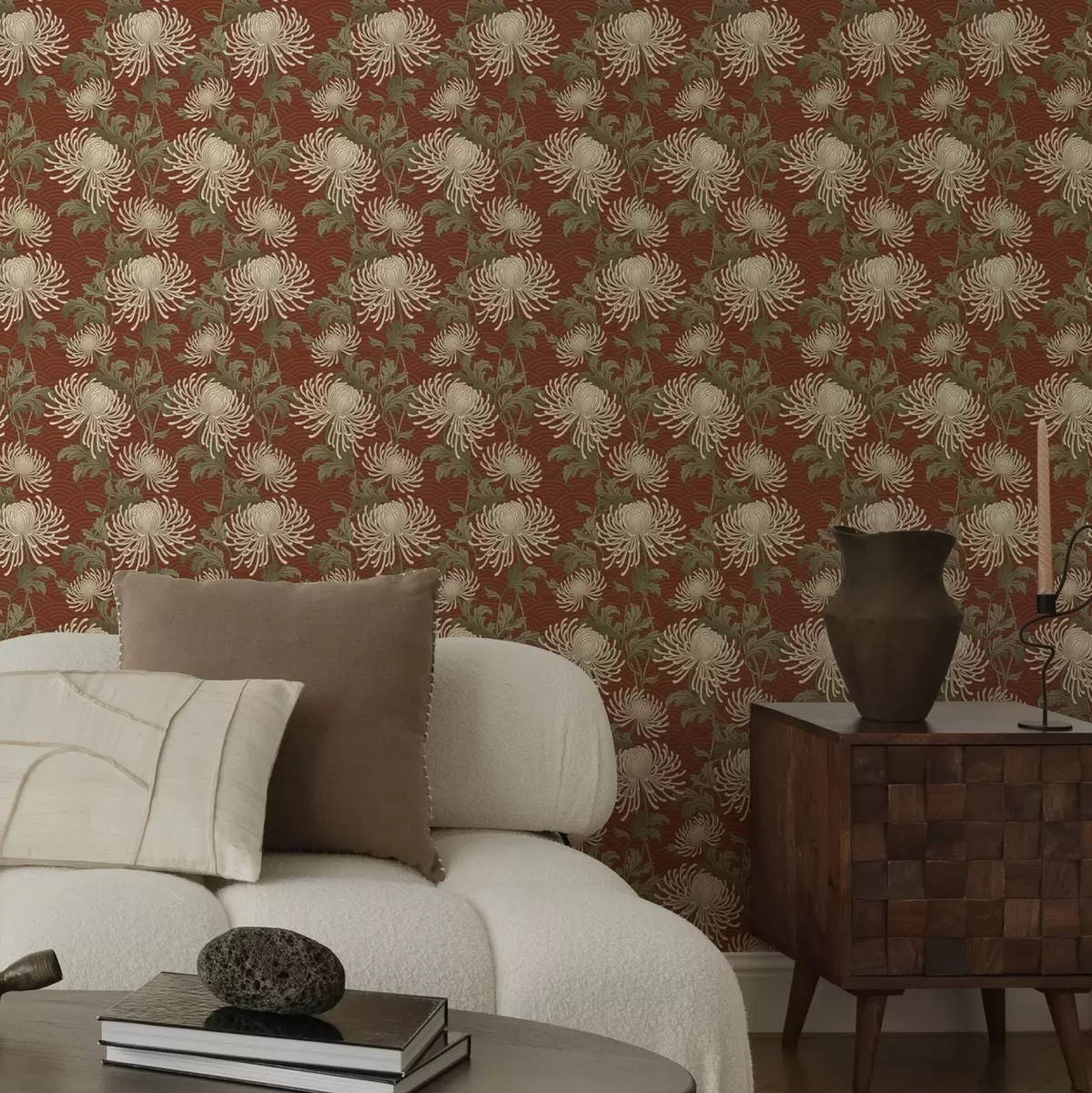 Papiers peints Chrysanthèmes crème sur fond terre cuite, style asiatique Nr. a00693