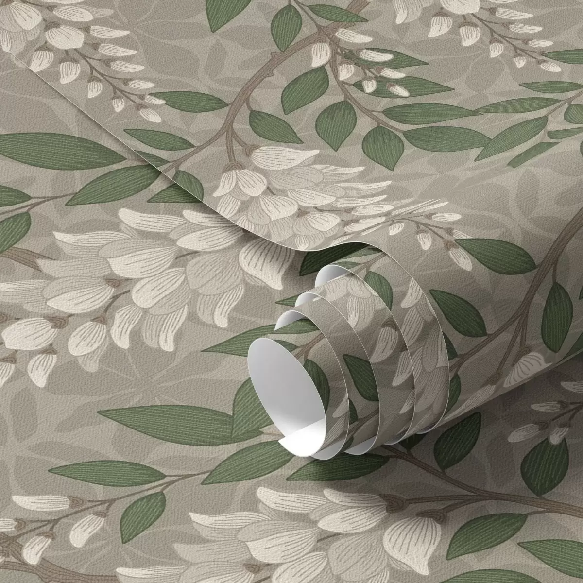 Papiers peints Glycine claire sur fond gris-olive, grappes en cascade Nr. a00694