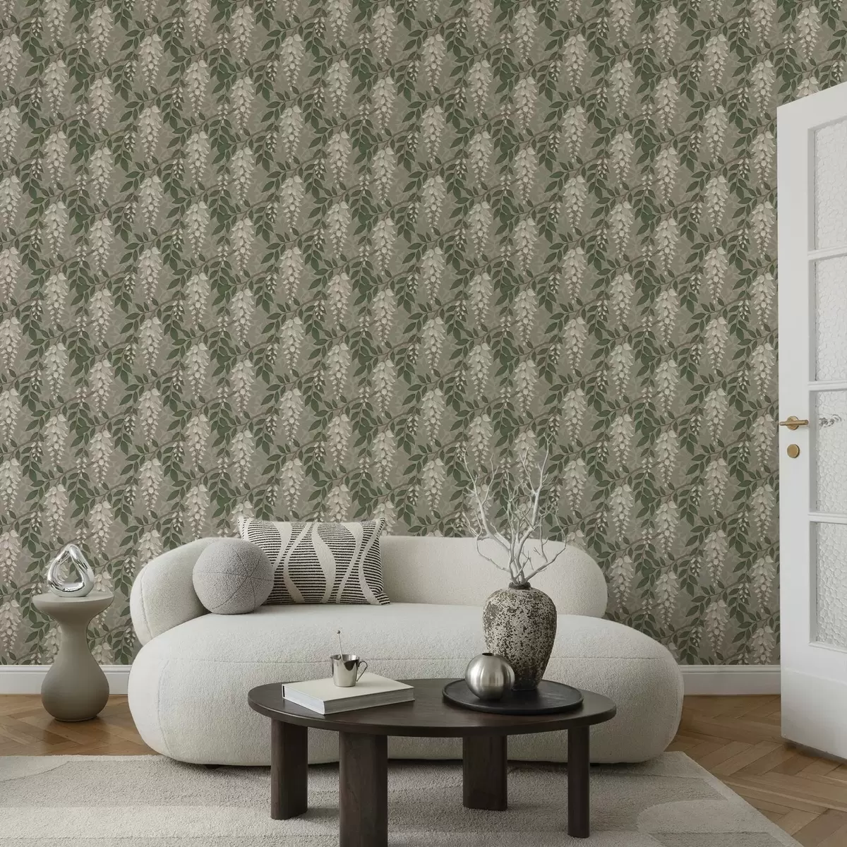 Papiers peints Glycine claire sur fond gris-olive, grappes en cascade Nr. a00694