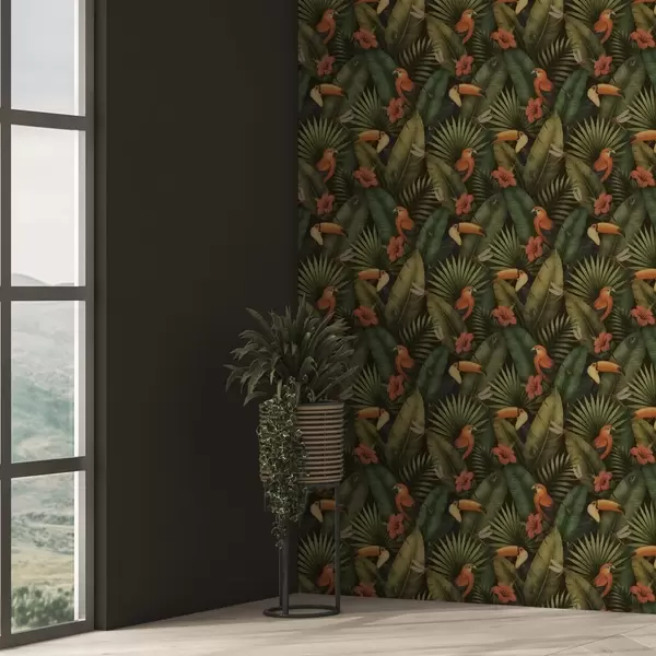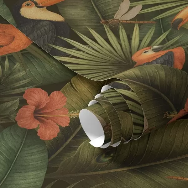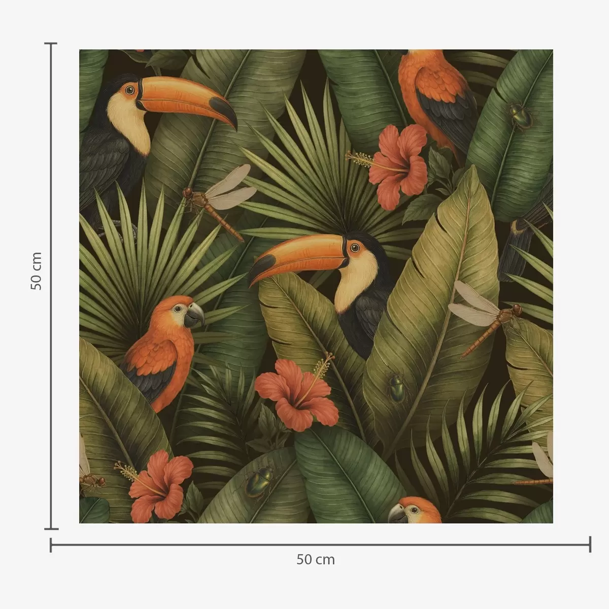 Papiers peints Toucan et perroquets parmi la végétation tropicale et les fleurs Nr. a00702