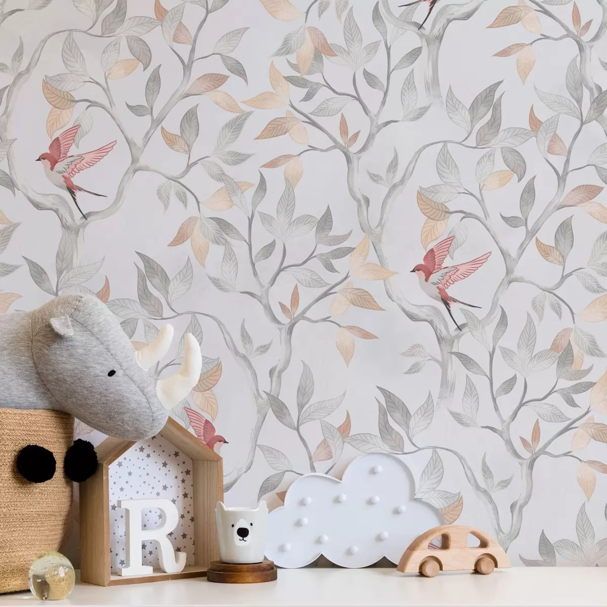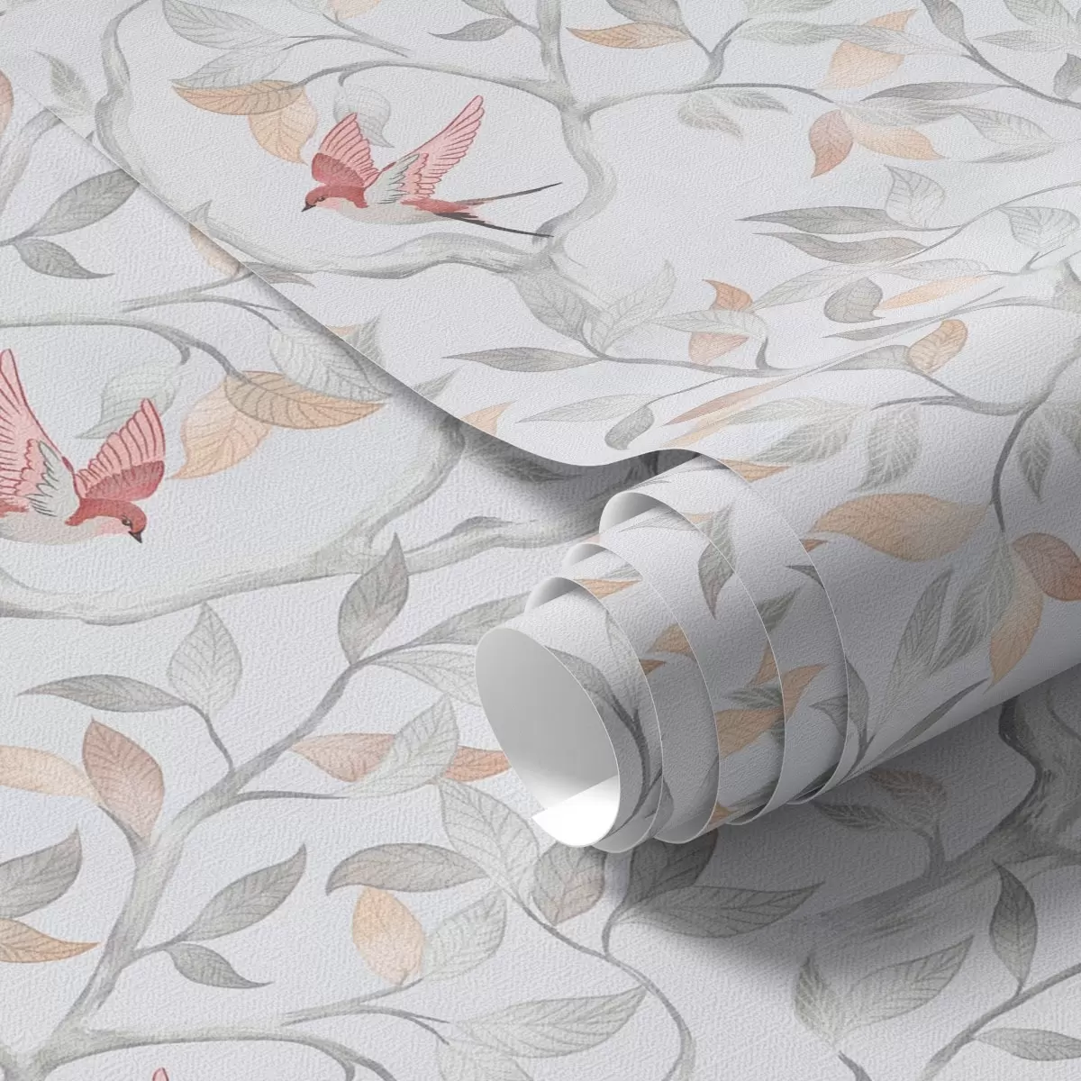 Papiers peints Branches légères avec feuilles et oiseaux dans les tons pêche Nr. a00716
