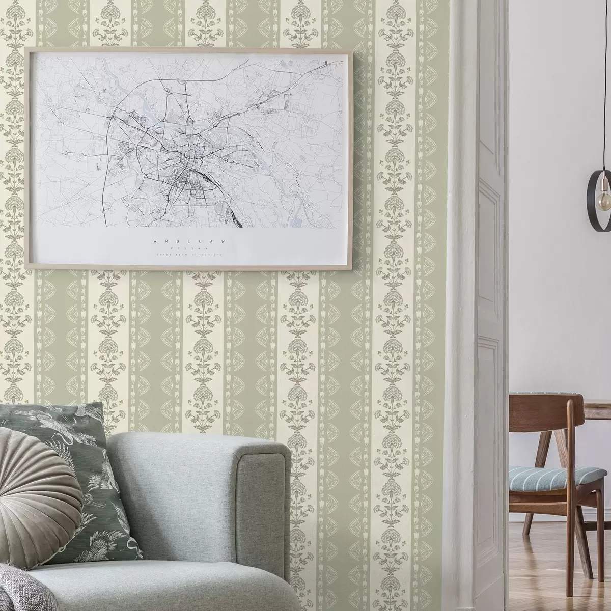 Papiers peints Ornement rayé avec colonnes florales dans les tons sauge Nr. a00719