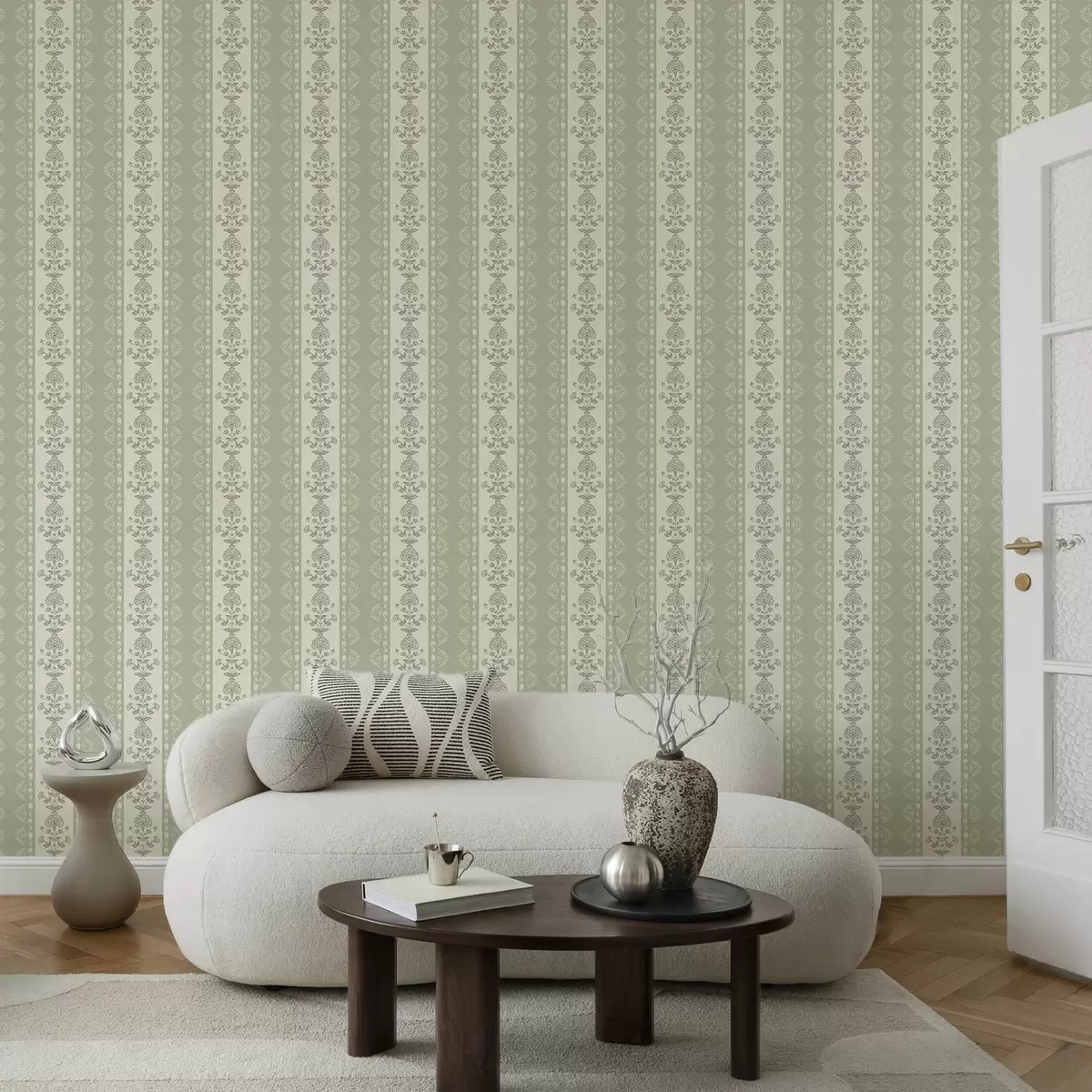 Papiers peints Ornement rayé avec colonnes florales dans les tons sauge Nr. a00719
