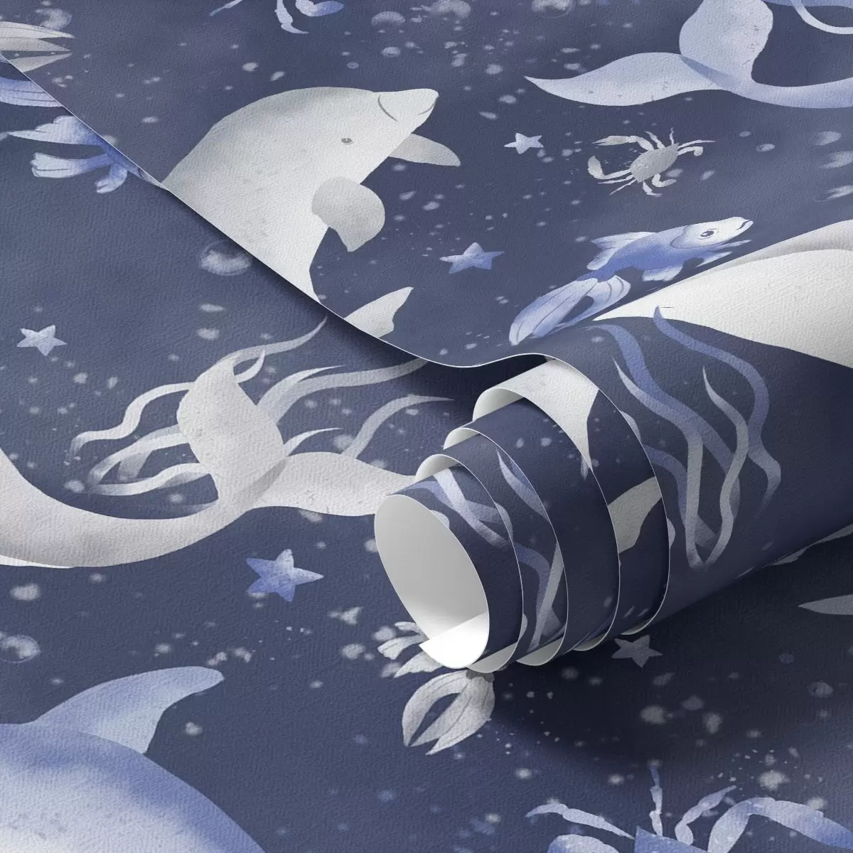 Papiers peints Baleines, dauphins et crabes sur fond bleu foncé Nr. a00720