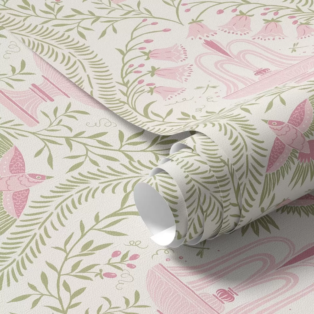 Papiers peints Fontaines, colibris et volutes vertes sur fond clair Nr. a00723