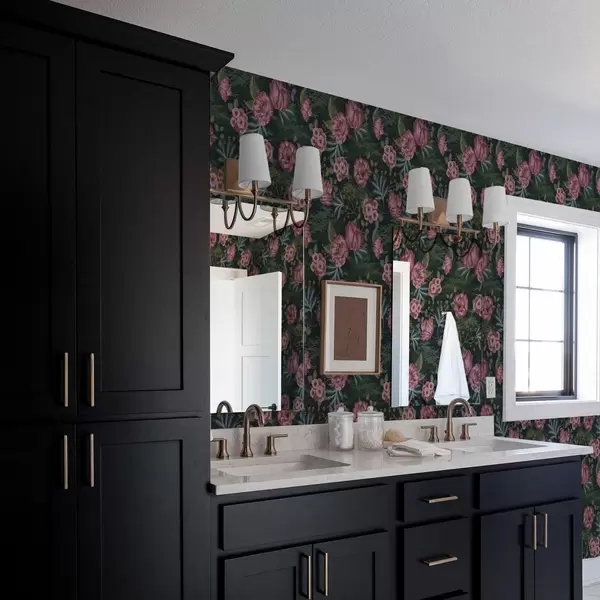 Papiers peints Flore sombre avec des fleurs et des feuilles roses, fond sombre Nr. a00724